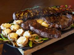 Deliciosas fajitas de Rib Eye y New York, champiñones gratinados, costillas, longaniza española y cuadritos de queso