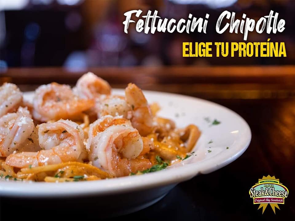 Carne o pollo aderezado con picosita salsa chipotle, cebolla, pimiento, champiñones y queso suizo
