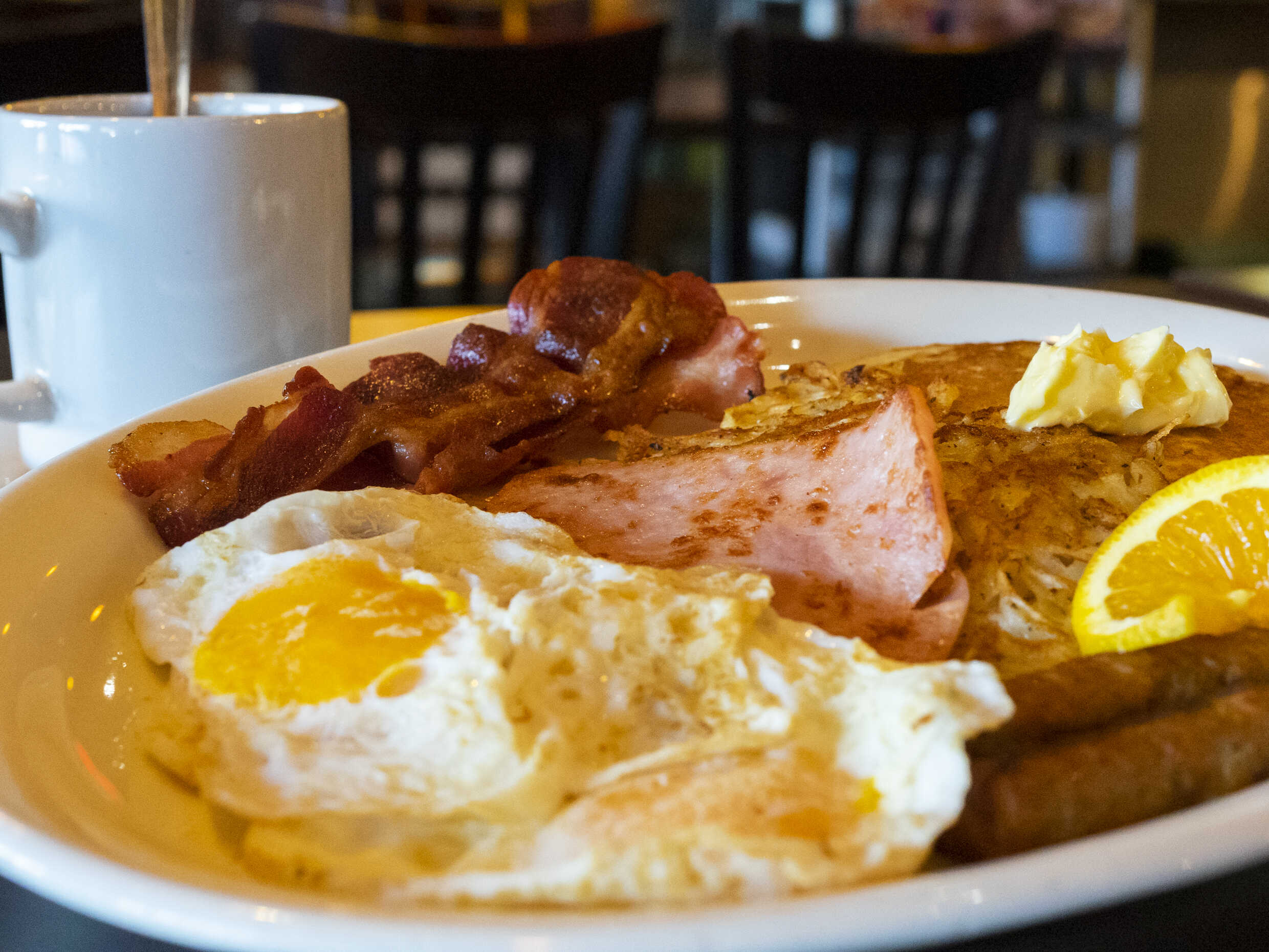 2 Huevos al gusto 2 sausage, 2 tiras de tocino ,papas hash brown acompañado de un pancake