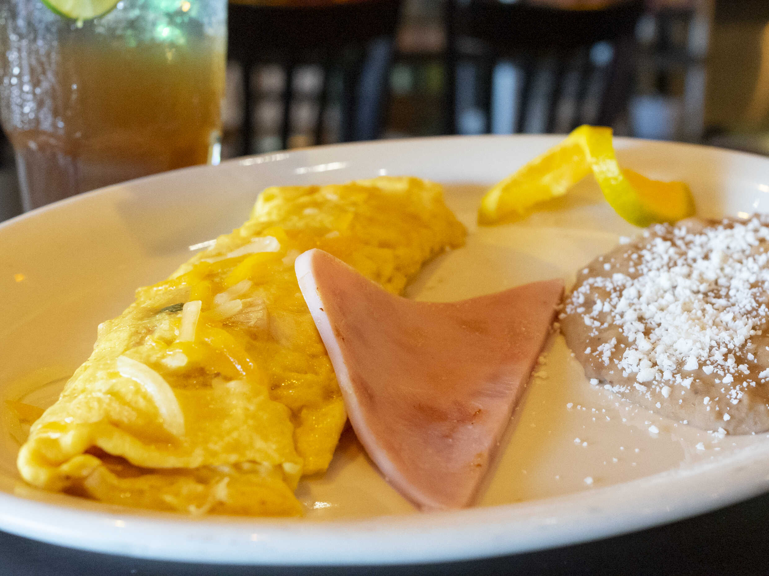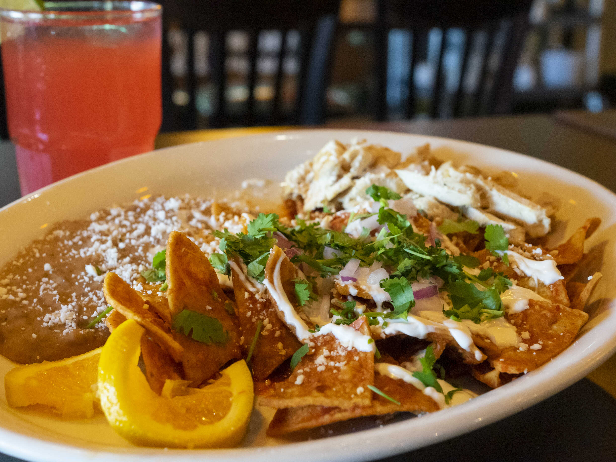Jugoso new york o arrachera de 300 gr huevo al gusto + chilaquiles y frijoles refritos