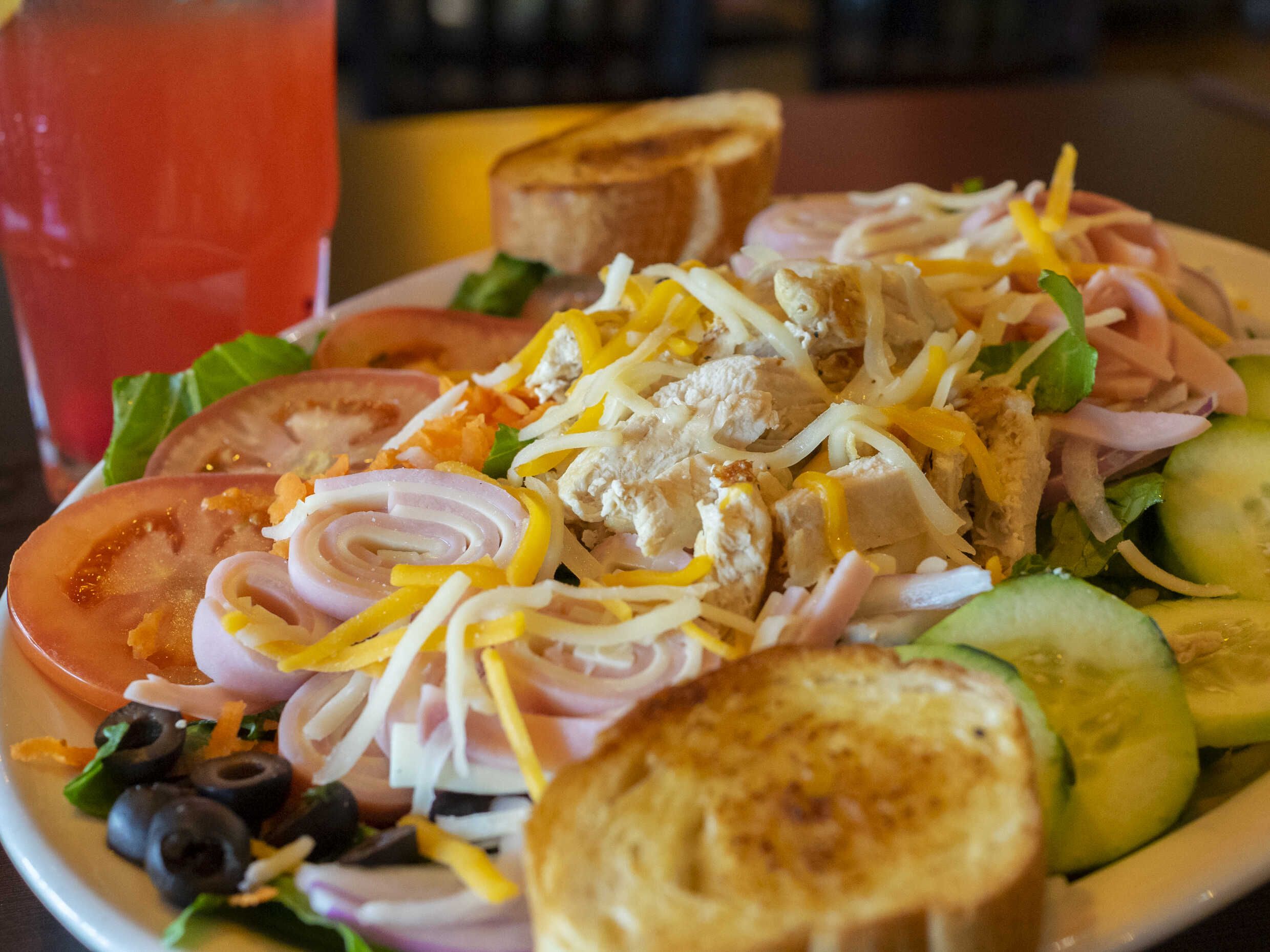 Lechuga fresca, espinaca tomate , cebolla , pepino en rodajas aceitunas negra, jamón de pavo , queso cheddar queso monterrey y pechuga de pollo a la plancha