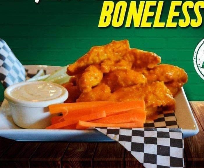 Deliciosos boneless con tu salsa favorita sobre queso mozzarella y salsa de la cas
