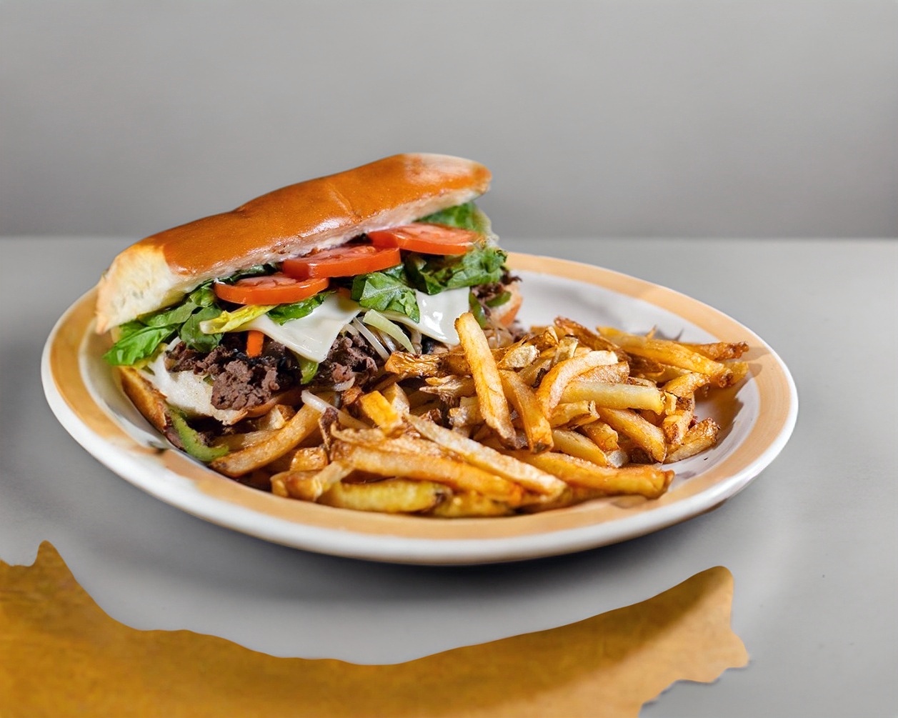 Nuestra marca de la casa, deliciosa carne o pollo a la plancha con cebolla, pimiento, champiñones y queso suizo. Incluye papas y bebida