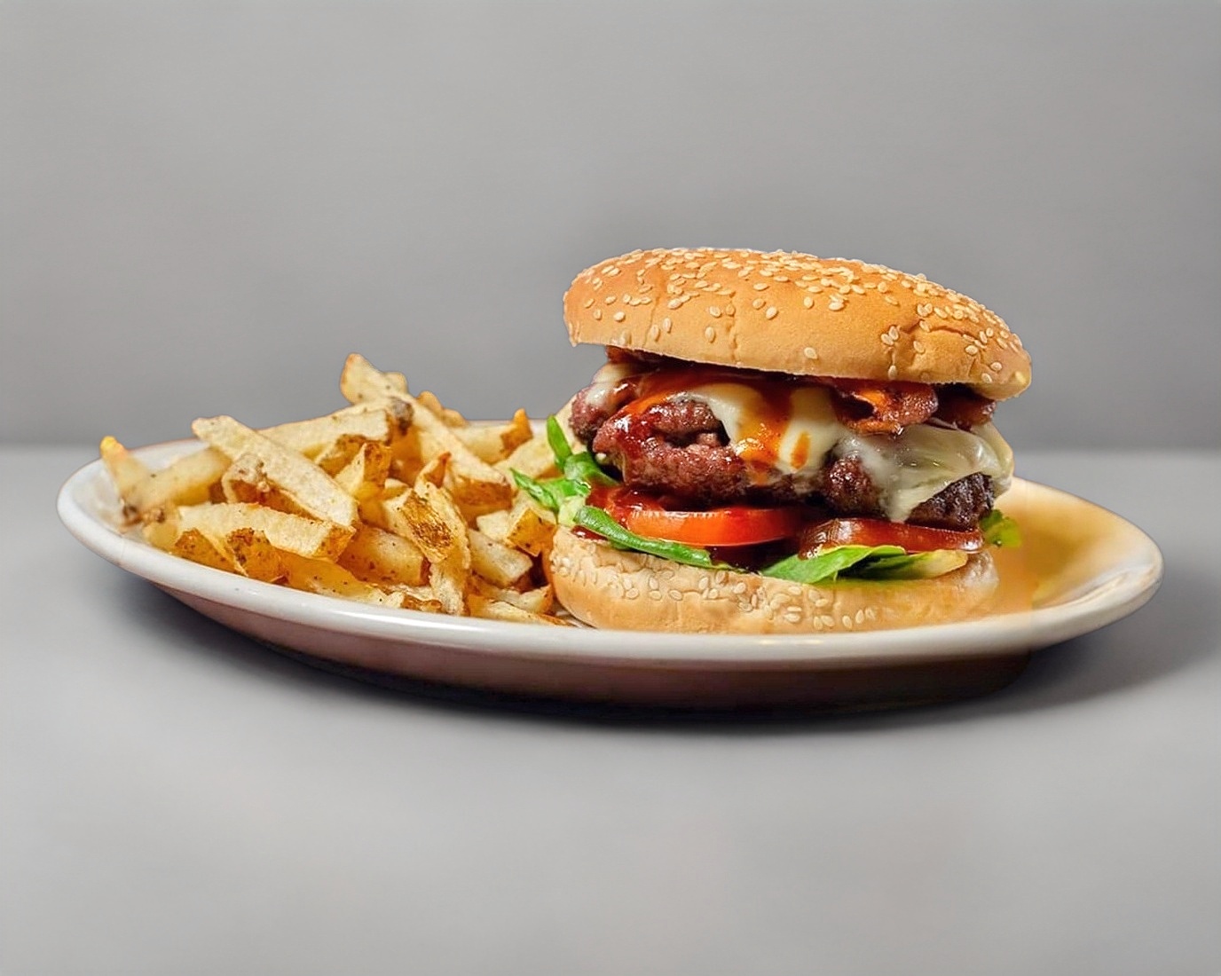 Carne o pollo on tocino, cebolla, pimiento, champiñones y queso suizo.