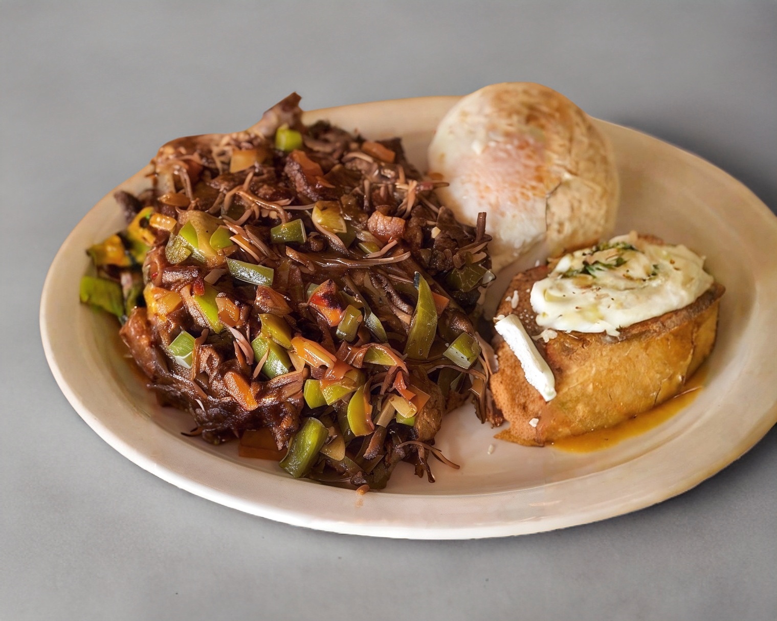 Sabrosos molletes de tu guiso a elegir: machaca, birria, carne con nopales, bistec ranchero o chicharrón prensado.