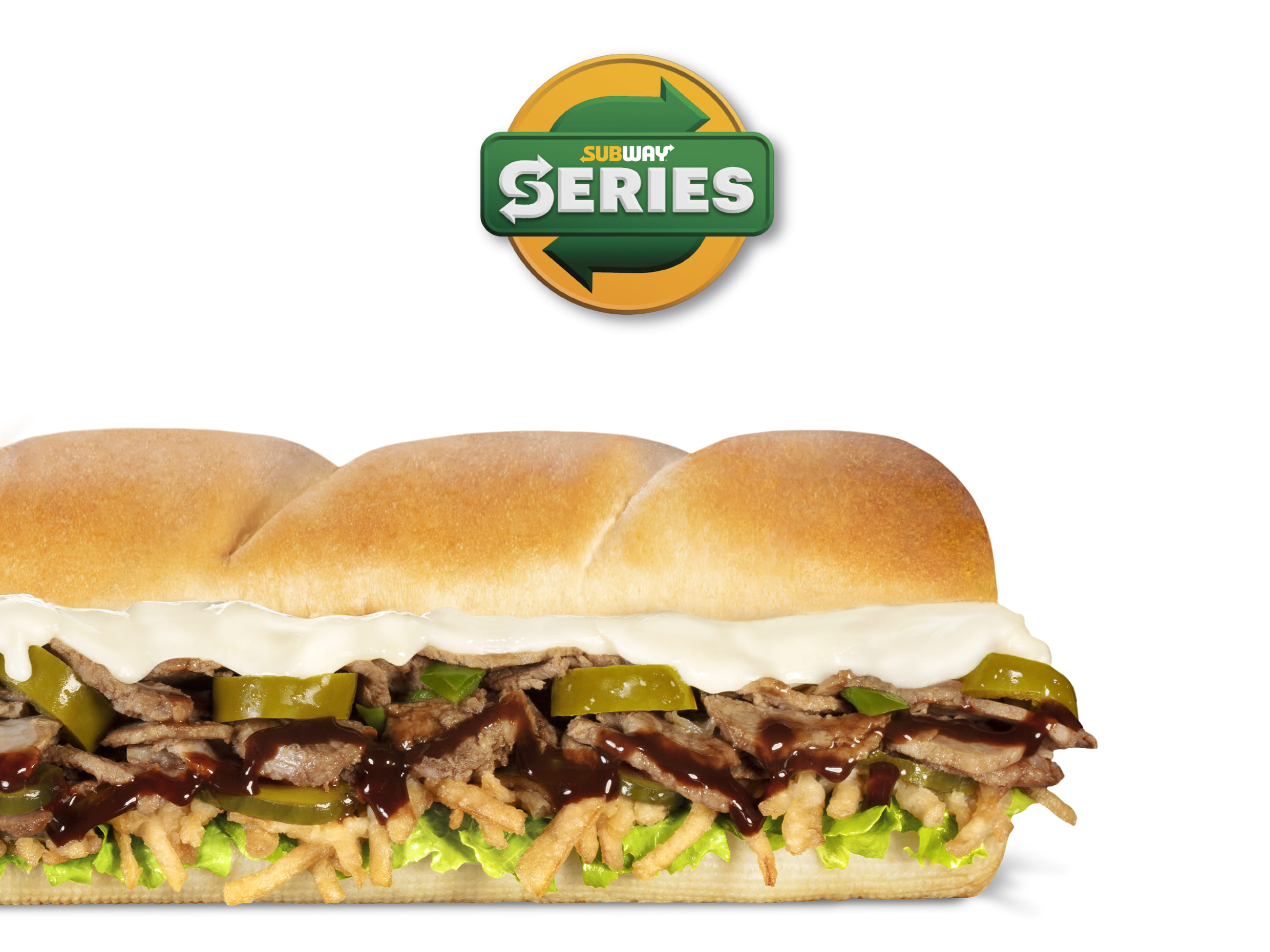 Pan blanco con tiras de carne de res, doble porción de queso mozzarella, cebollitas crujientes, lechuga, jalapeños, pepinillos y aderezo de salsa BBQ.