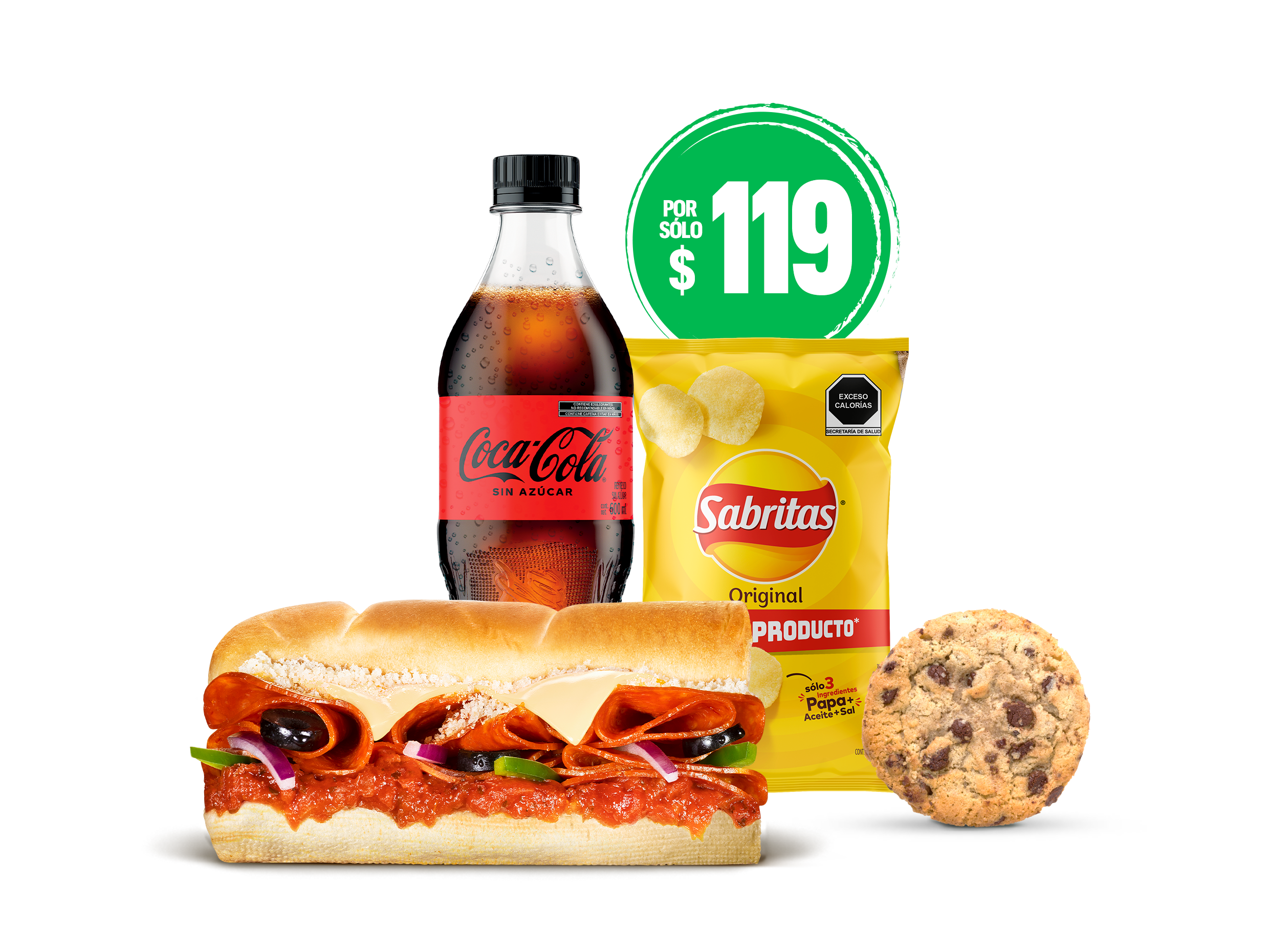 El mejor combo: Sub 15 cm Pizza Sub + bebida 600 ml + papas Sabritas + galleta.