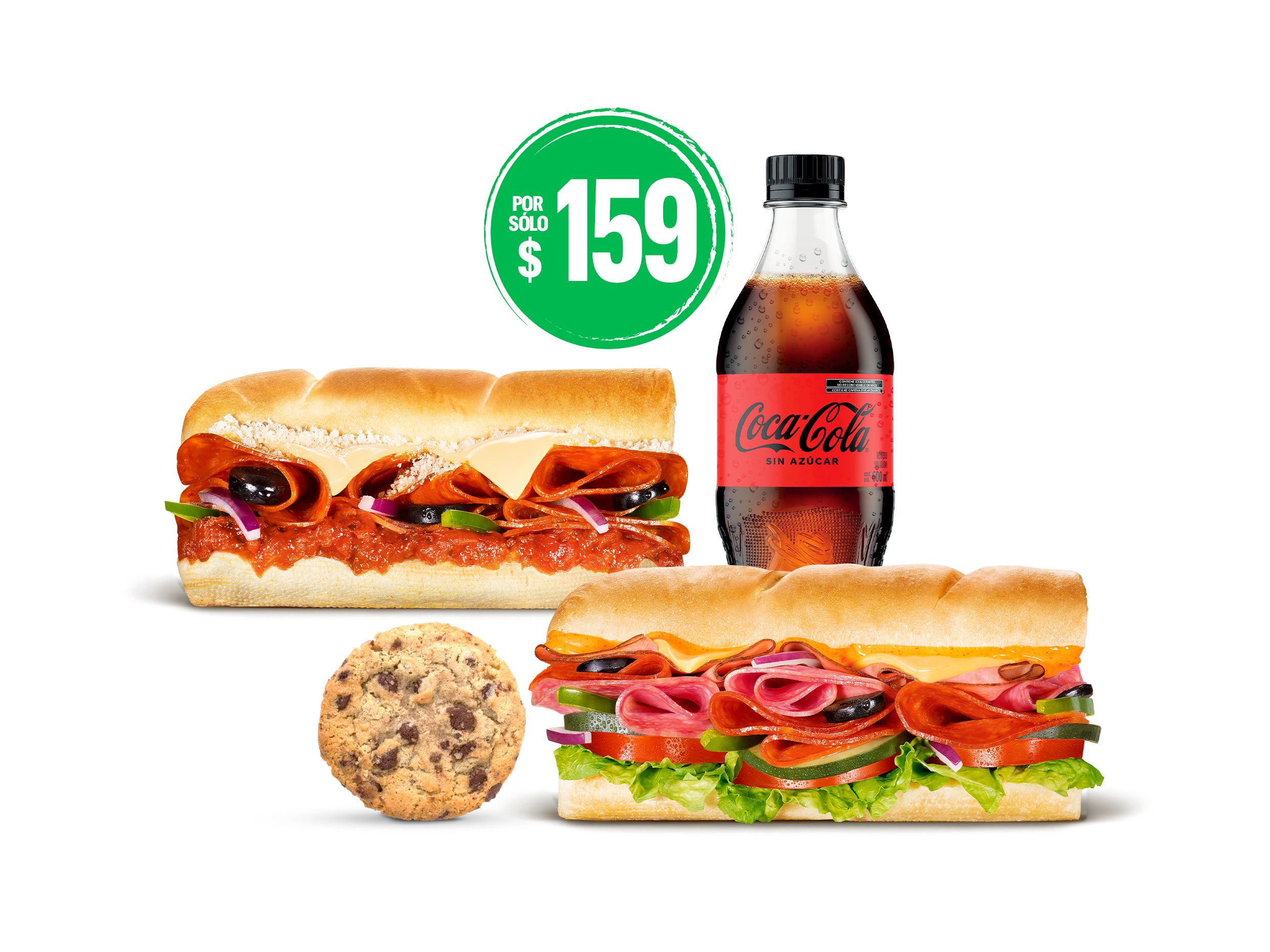¡Por tiempo limitado! Lleva 2 Subs de 15 cm + 2 bebidas embotelladas de 600 ml + 2 Galletas por $189. Elige tus 2 Subs entre Italiano B.M.T®, sub de Pollo o Pollo Parmesano