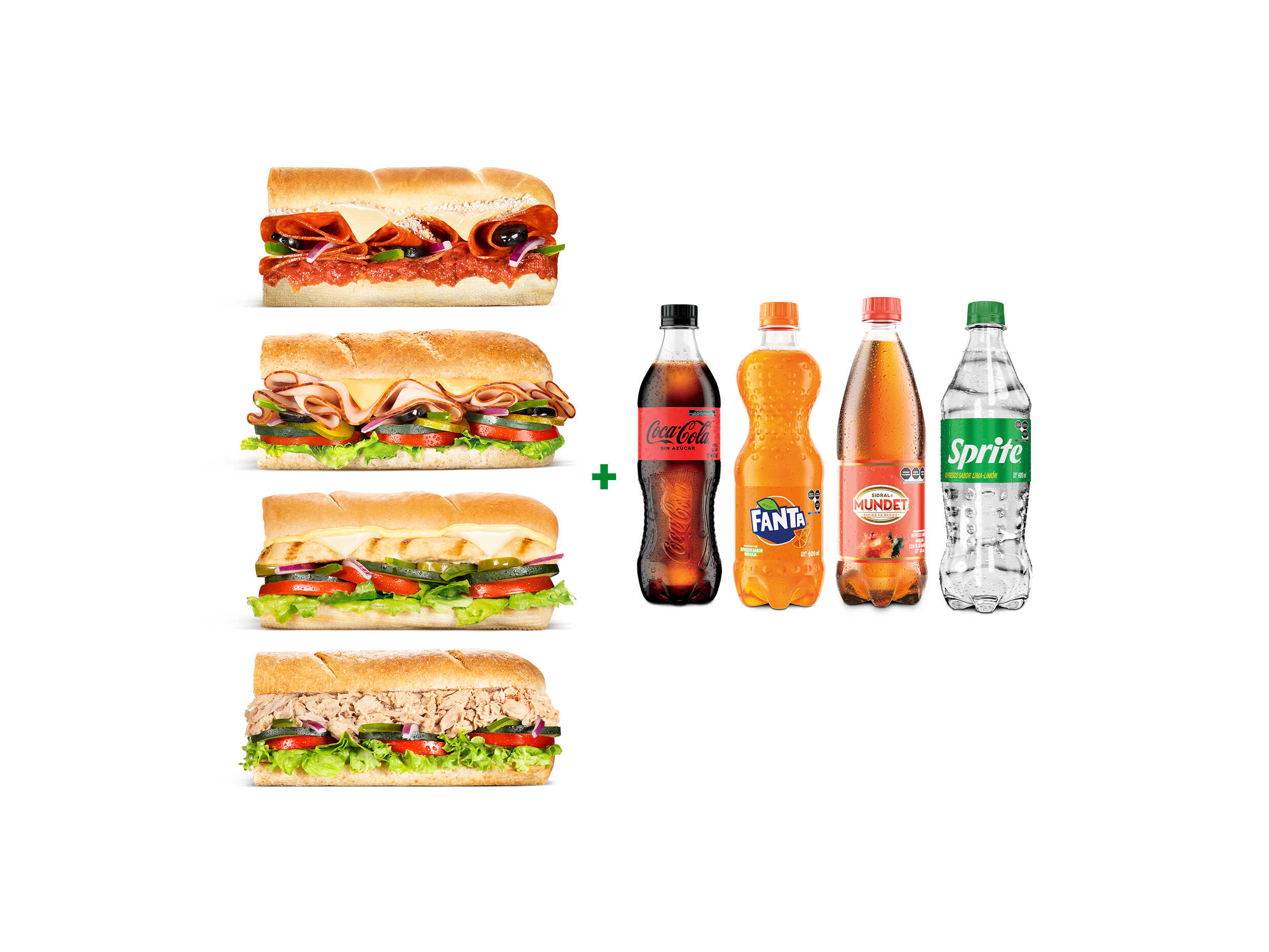 Incluye: 4 Subs de 15 cm a elegir entre Pollo, Jamón de Pavo, Pizza, Atún)