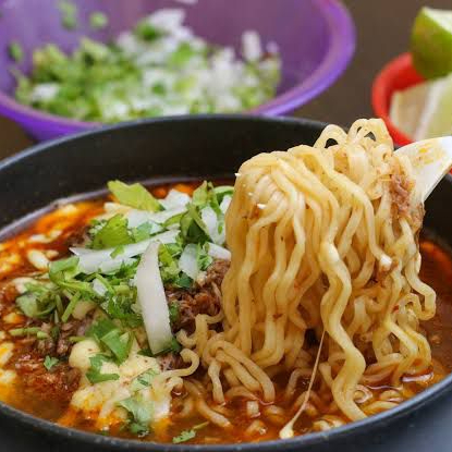 Ramen preparada con jugo y carne a elegir(Borrego o Cabeza) Incluye 3 tortillas de maiz, repollo, cebolla, cilantro, limon y salsa