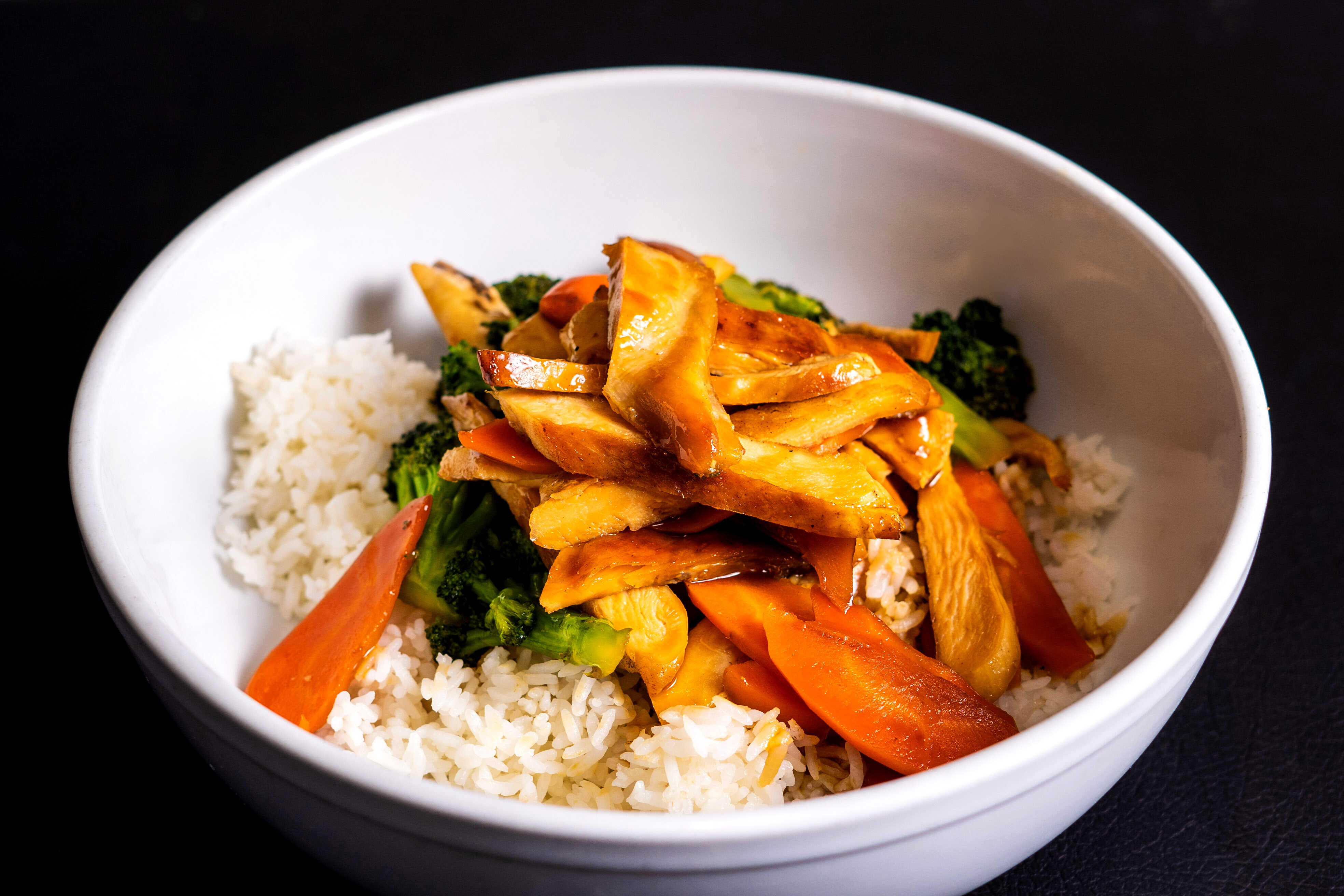 Explora la fusión de sabores en nuestro Teriyaki de Pollo. Una cama de arroz blanco, zanahorias y brócoli es arropada por una salsa teriyaki que resalta la jugosidad del pollo