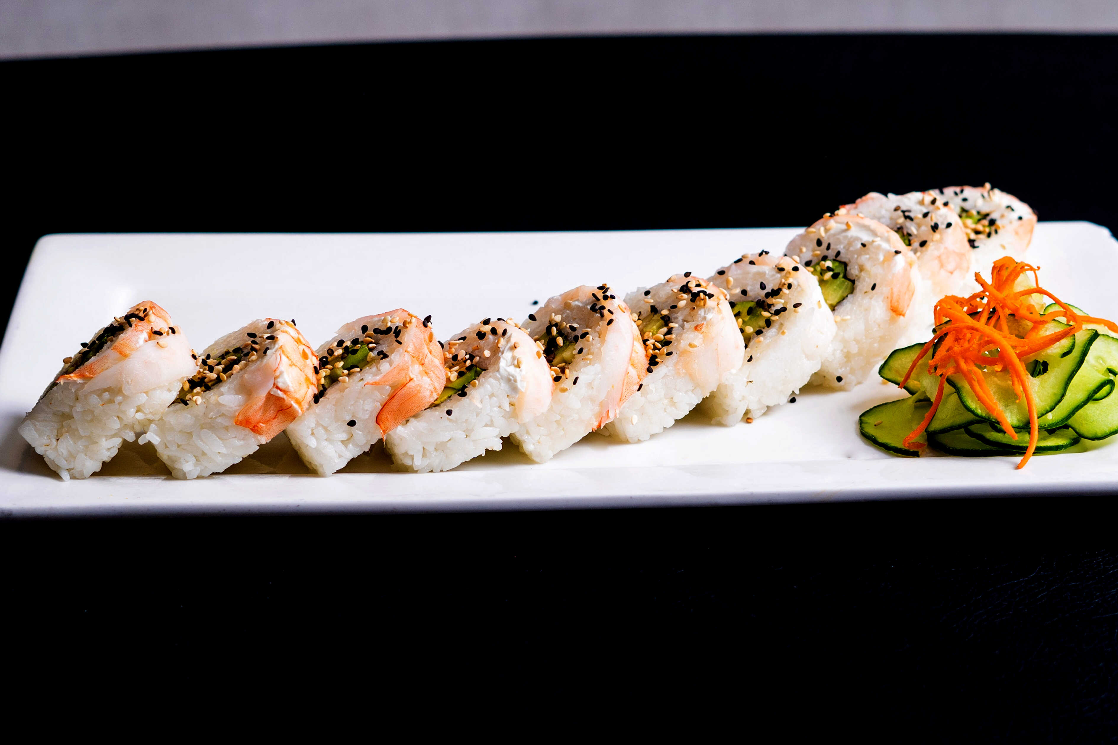 Por dentro aguacate y pepino, por fuera camarón, ajonjolí y queso Philadelphia.