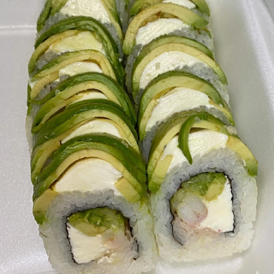 camaron,queso crema,pepino y aguacte,forrado de aguacate con toping de aguachile tropical