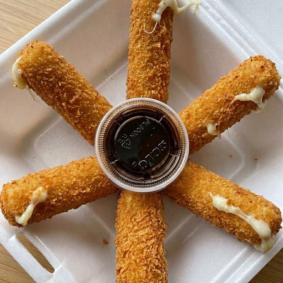 6 piezas de dedos de queso empanizados acompañados de salsa anguila (+$20, empanizado flaming hot)