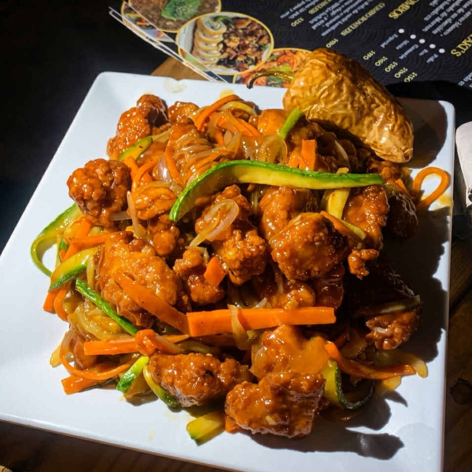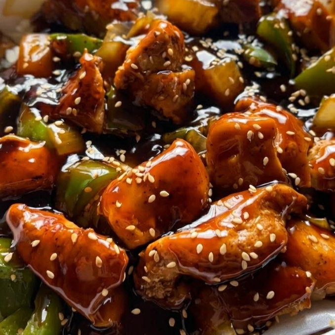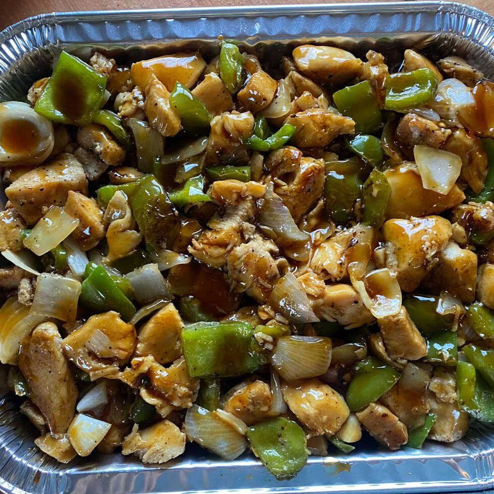 Cama de arroz blanco, pechuga de pollo acompañada de morrón y cebolla bañada en salsa de teriyaki.