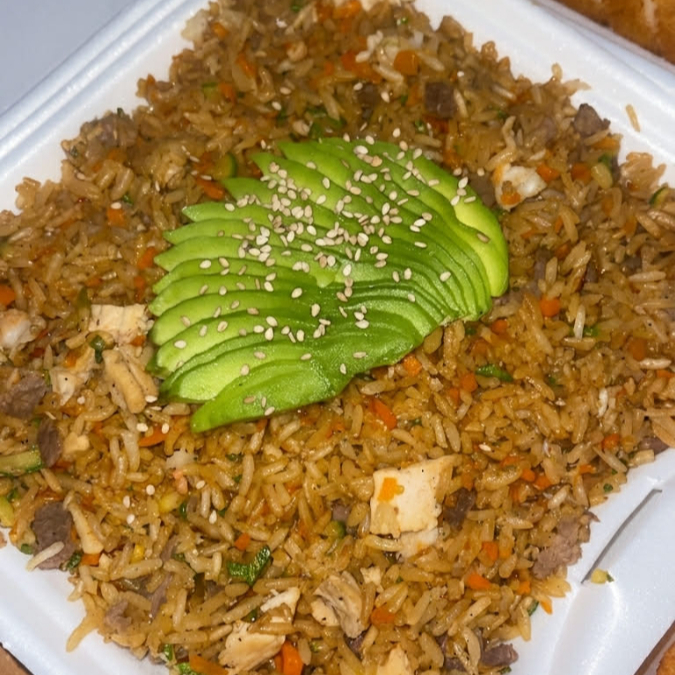 Arroz frito con verduras a la mantequilla con la proteína de su elección con topping de aguacate.