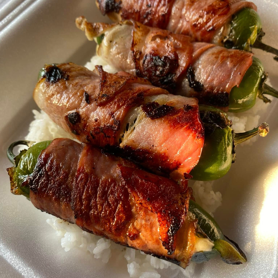 4 pieza de chiles jalapeños rellenos de queso manchego envueltos en tocino