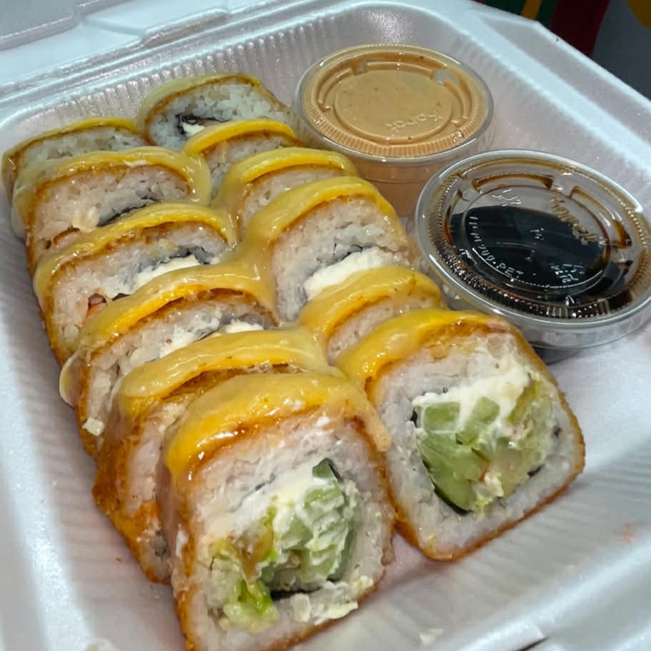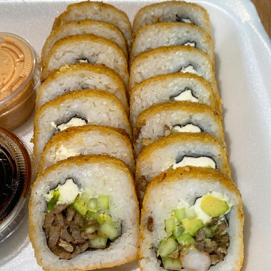 cangrejo empanizado, queso crema, pepino, aguacate toping de tampico con cangrejo empanizado bañado en salsa anguila