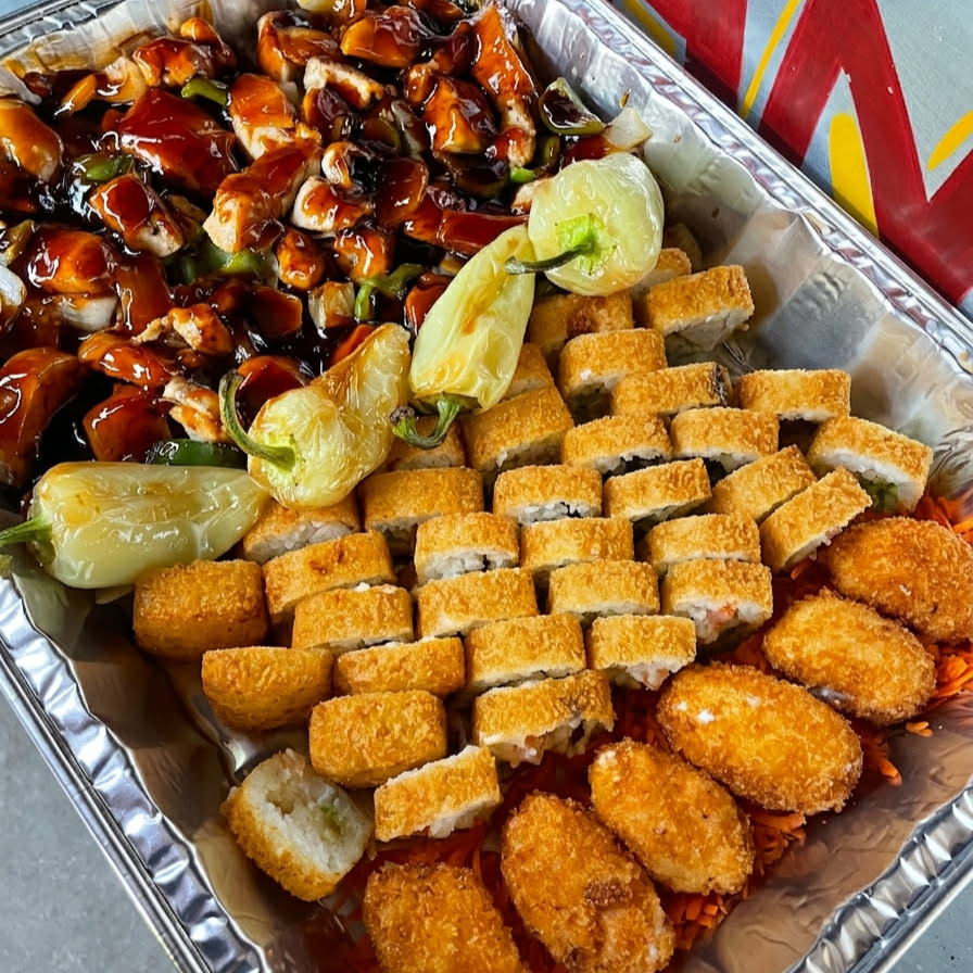 Charola grande con 3 rollos a elegir, teriyaki de pollo y 1 orden de kushages.