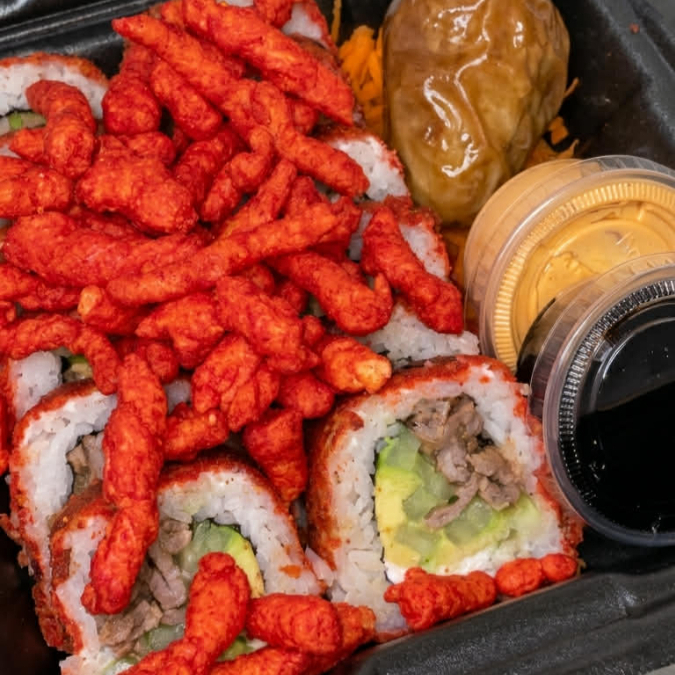 Camaron, queso crema y aguacate. Topping de chetos flaming hot con alga
