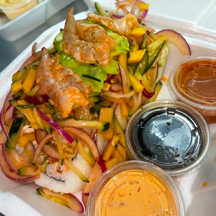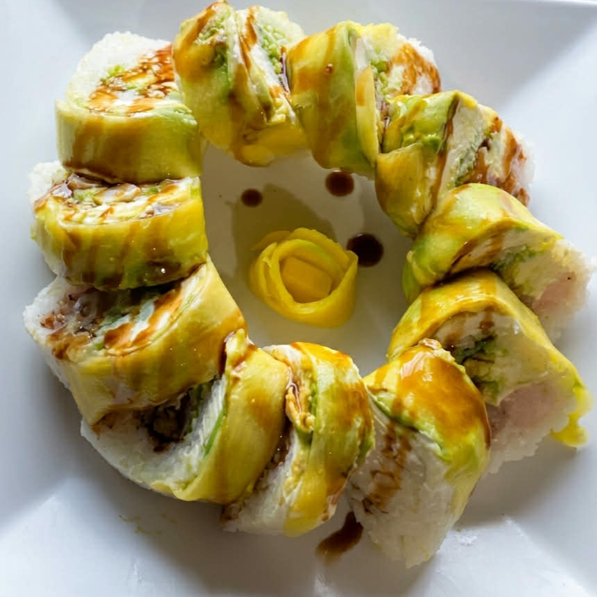 Camaron, pepino, aguacate y queso crema. Forrado con mango, bañado en anguila