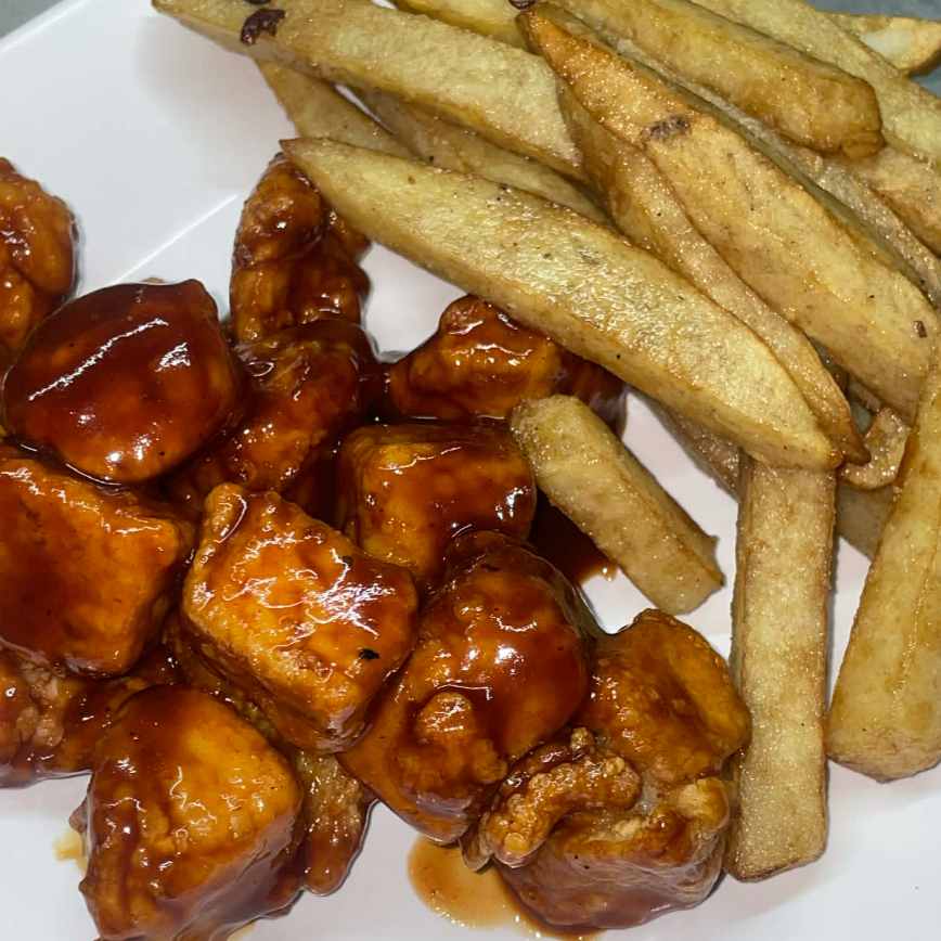 Orden de boneless (12 pza), acompañado de papas y aros de cebolla.
