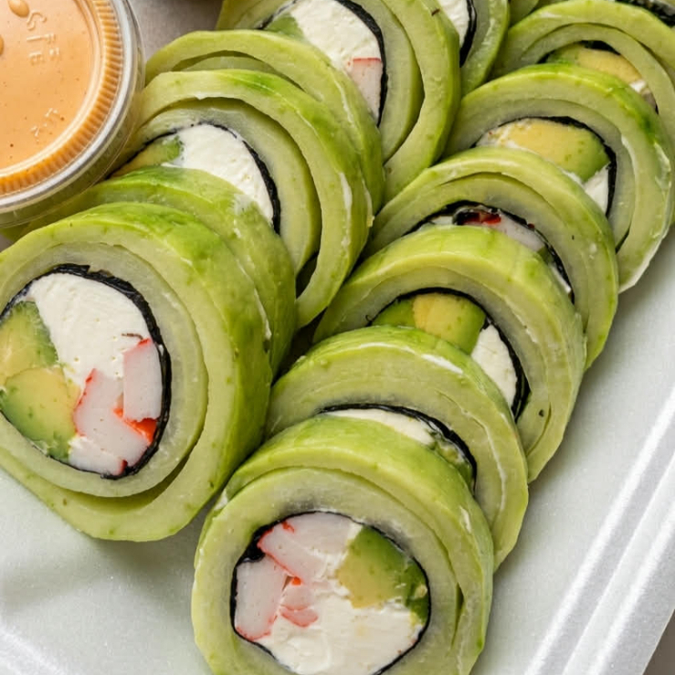 (Rollo de pepino), relleno de surimi, aguacate, pepino y queso crema