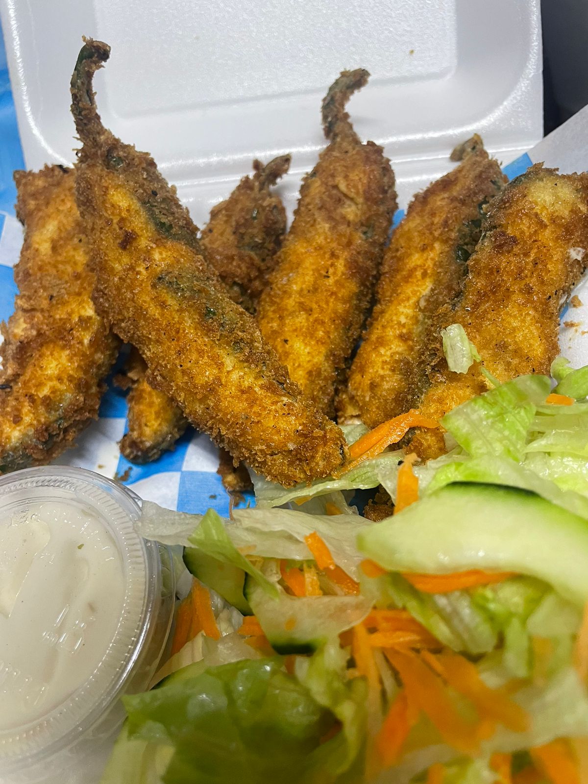 6 Chiles rellenos de queso Philadelphia y empanizados.