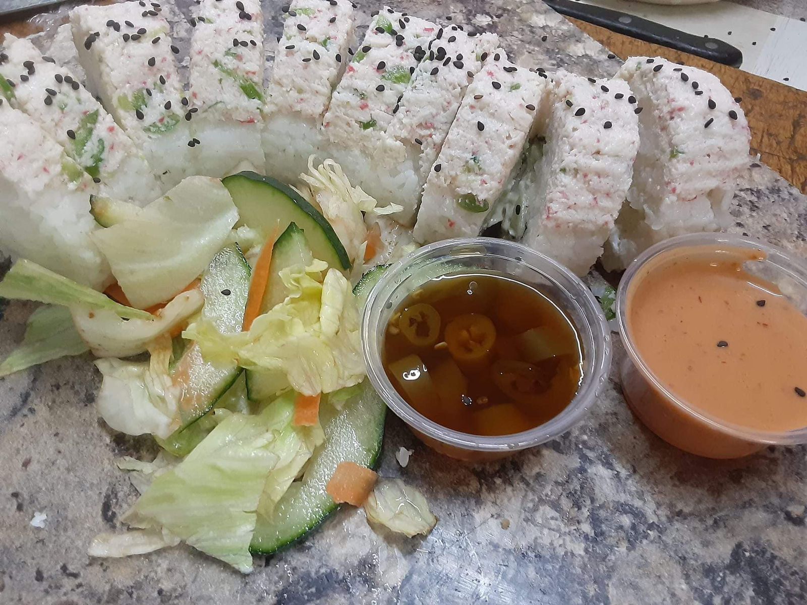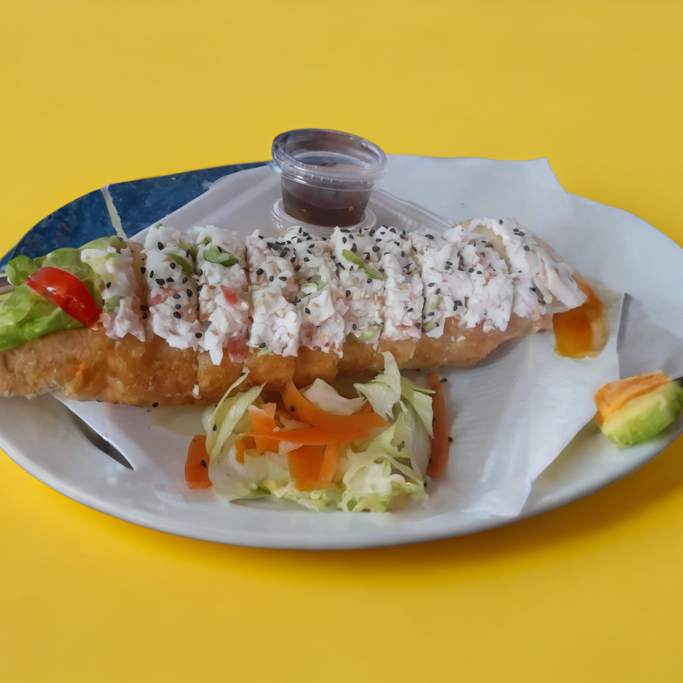 Relleno de surimi, aguacate, pepino, queso Philadelphia, alga marina, empanizado y forrado de tampico.