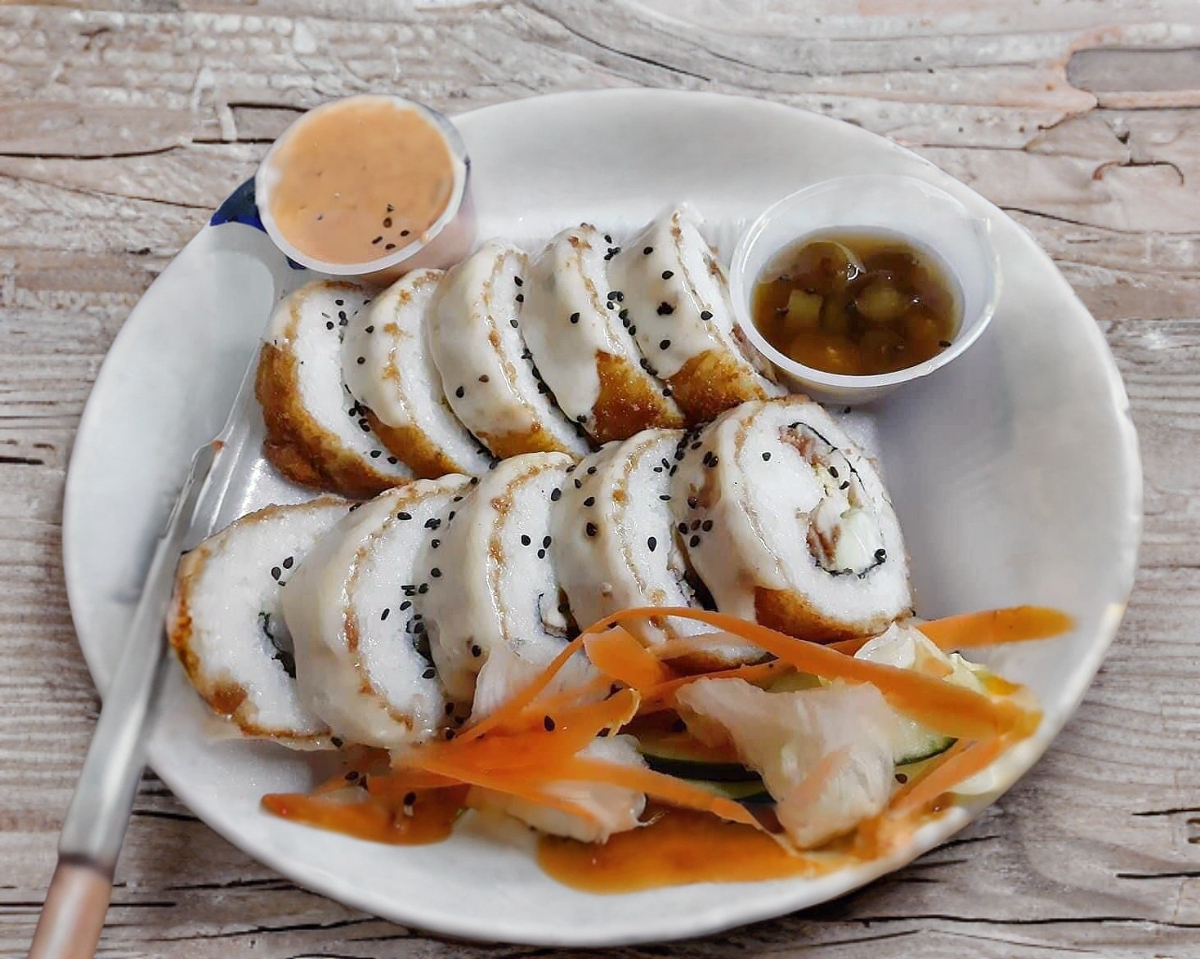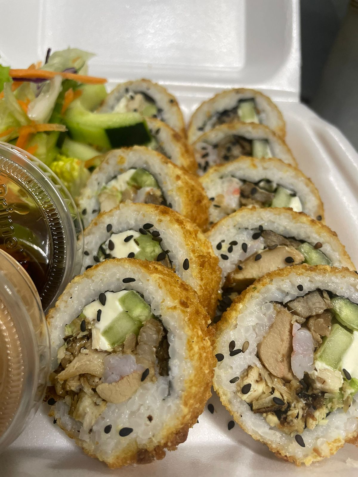 Relleno de pollo, res, aguacate, queso Philadelphia, pepino, alga marina y empanizado.