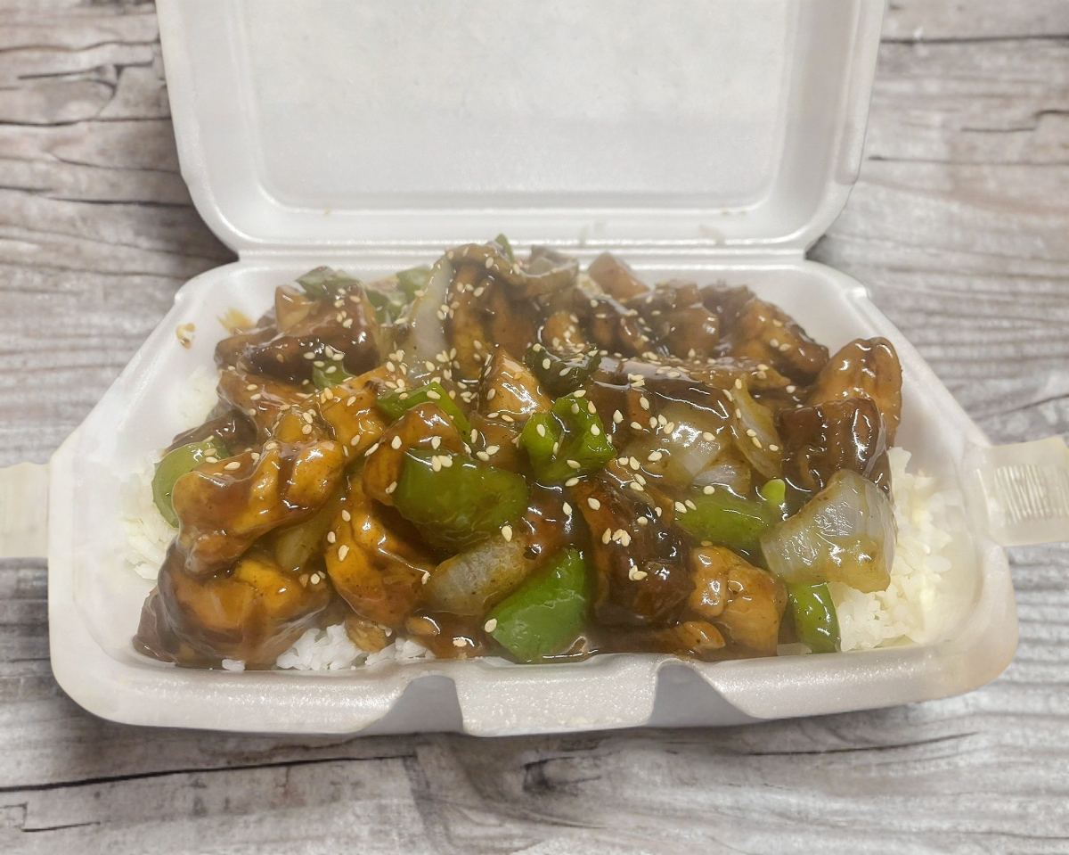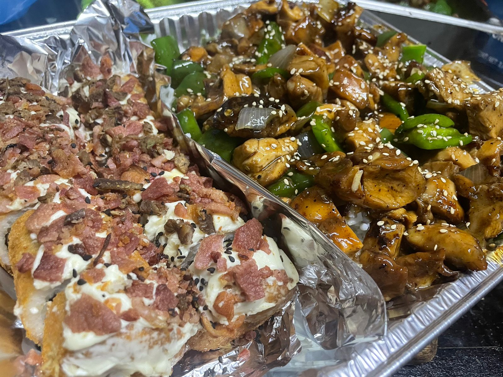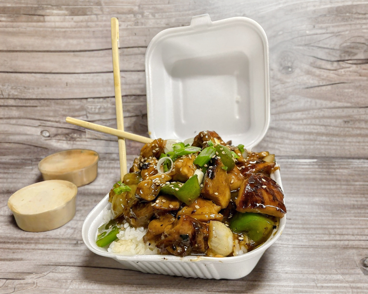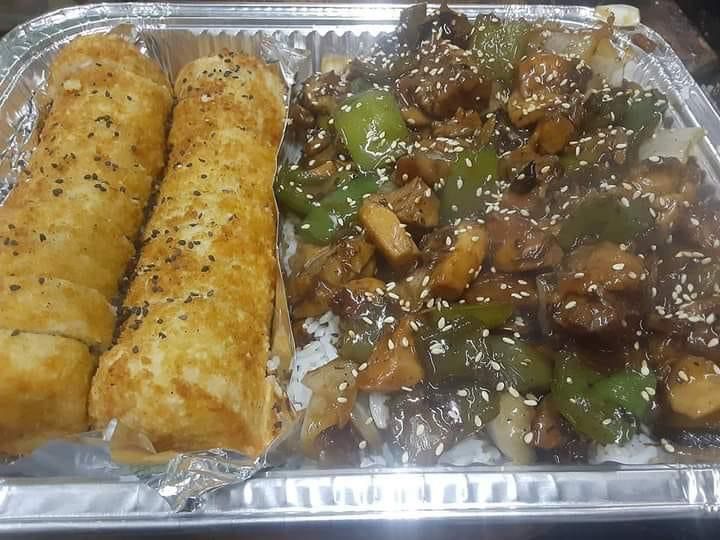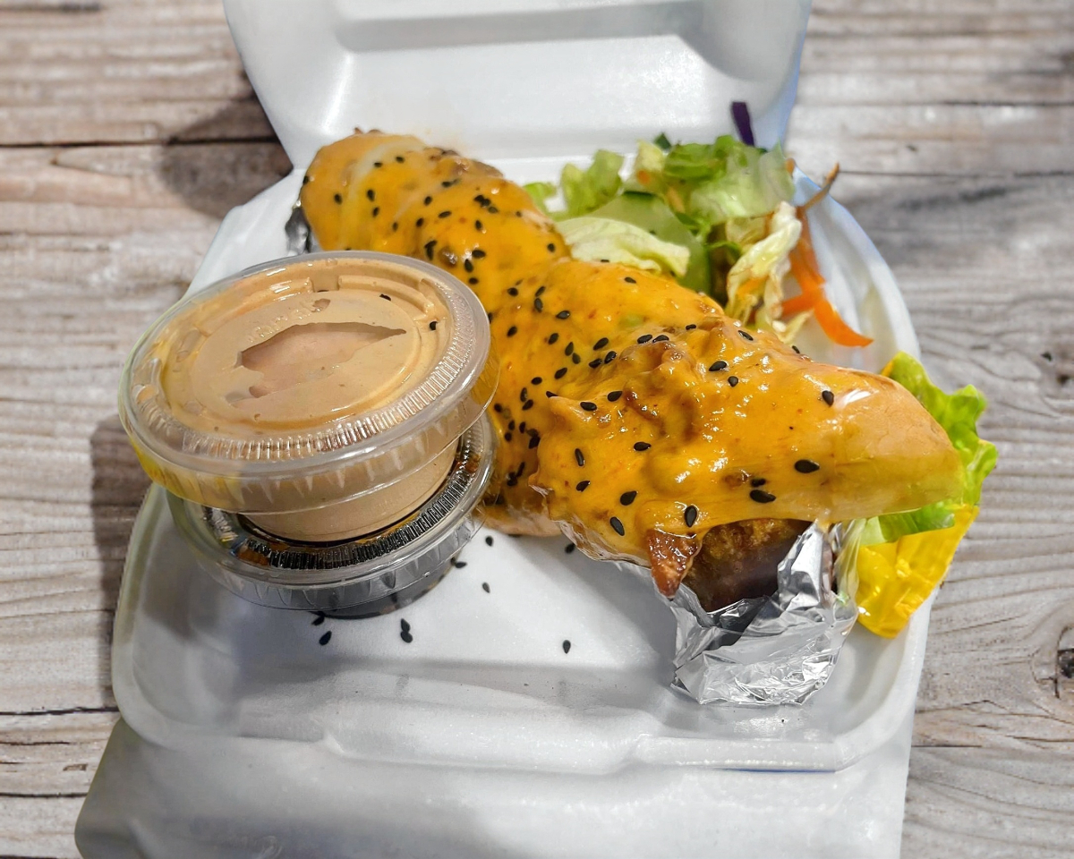 Teriyaki de pollo, 2 rollos chess bacon empanizados.