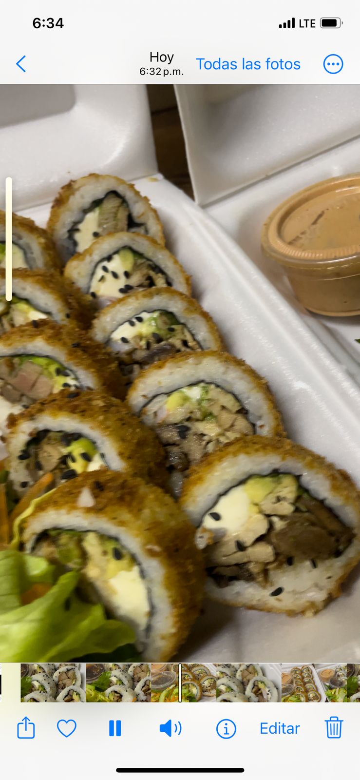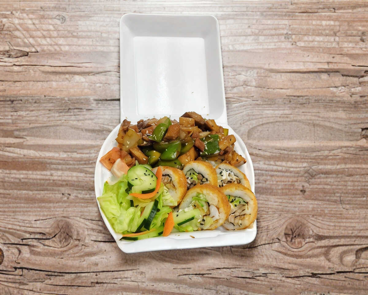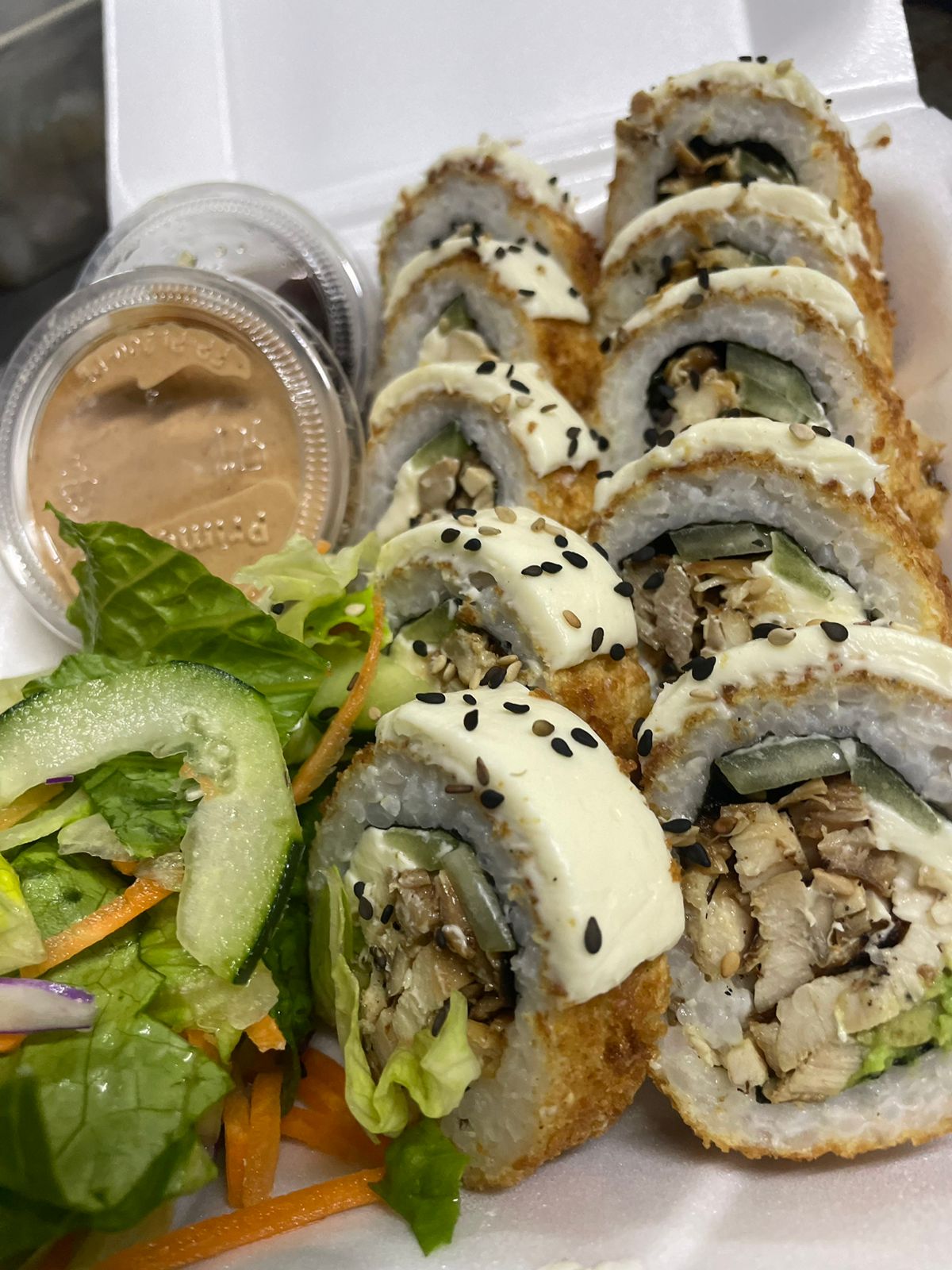 Teriyaki de pollo, 2 rollos cielo mar y tierra empanizados.