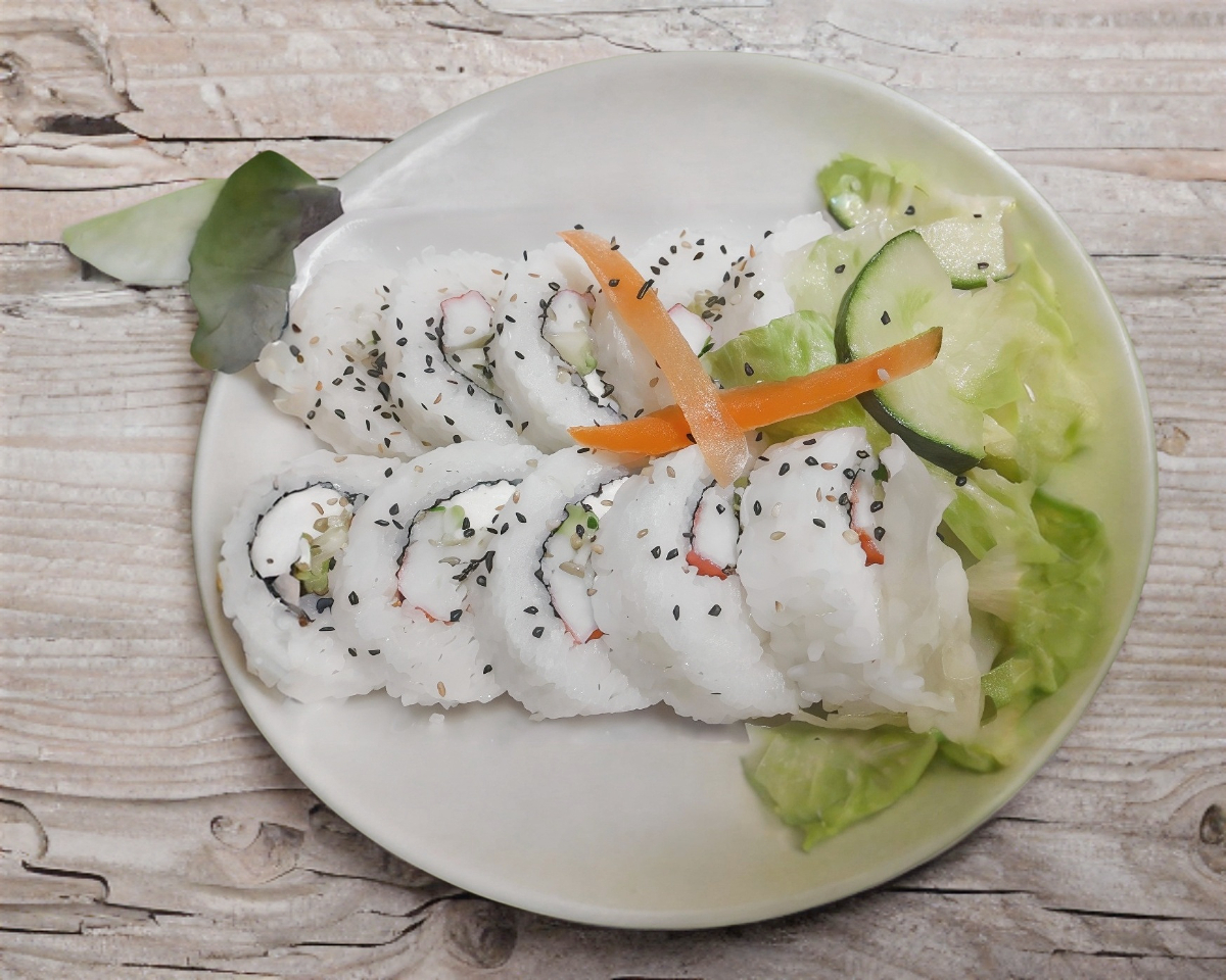 Relleno de surimi, aguacate, pepino, queso Philadelphia, alga marina y natural.