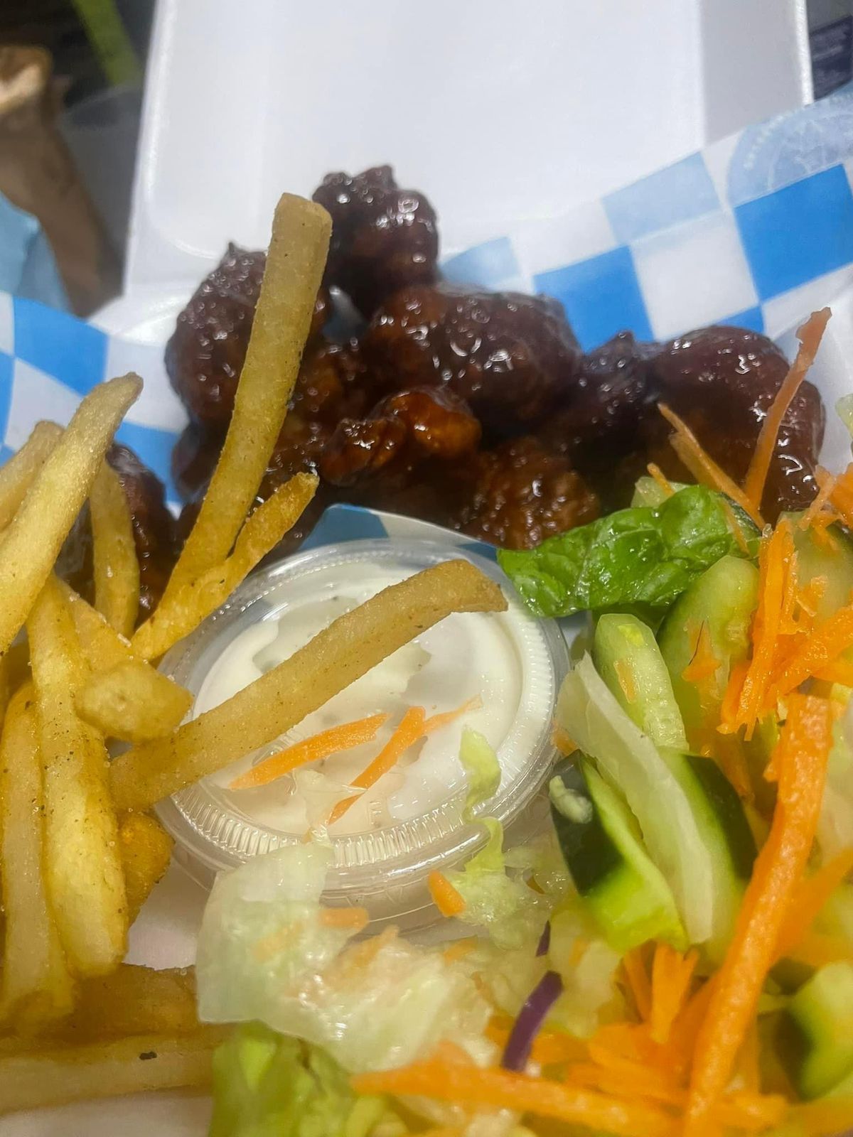1 Docena de boneless, ensalada, aderezo ranch y papas fritas.