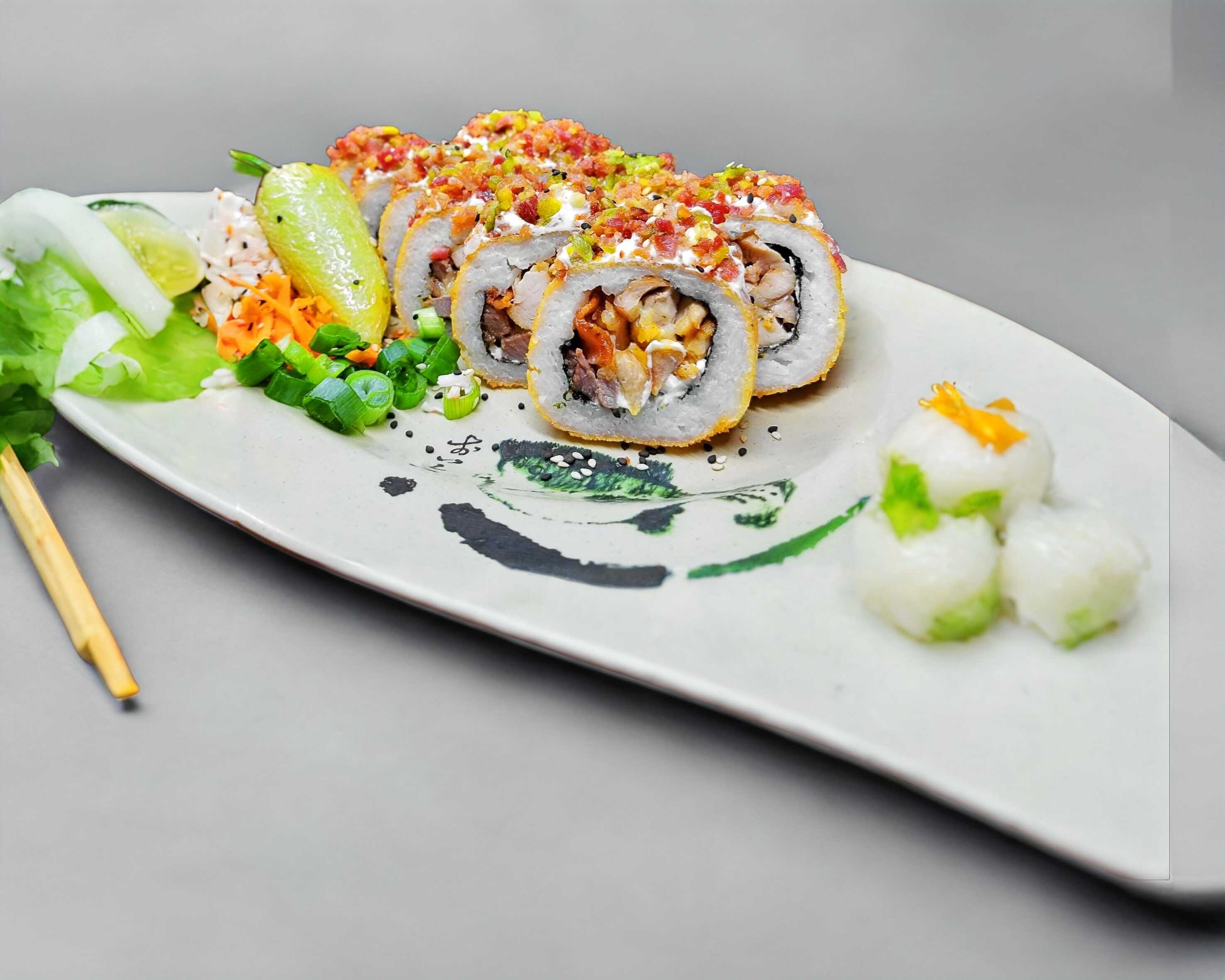 Carne, pollo, tocino, monterrey y Philadelphia. Forrado de Philadelphia, tocino y chili serrano.