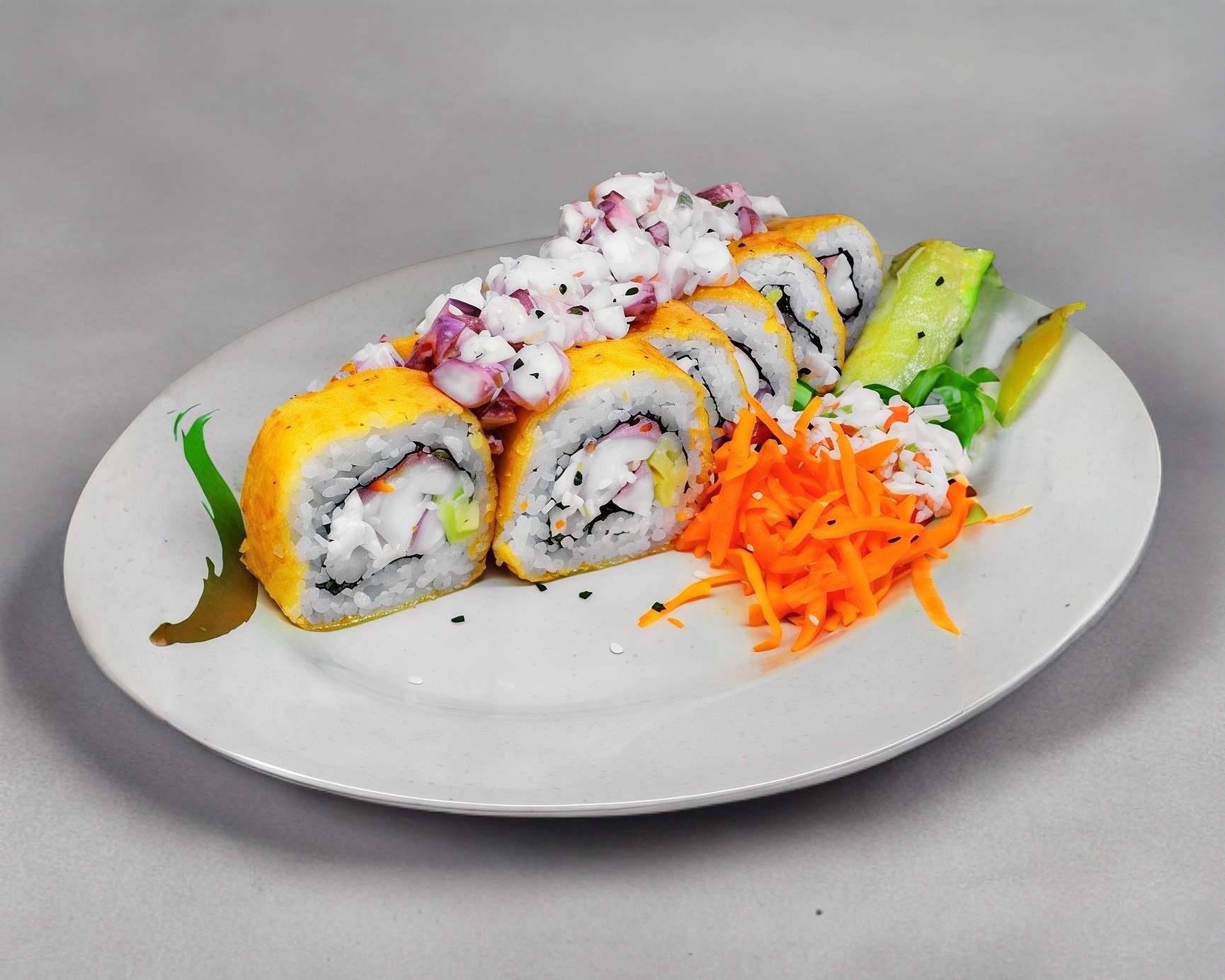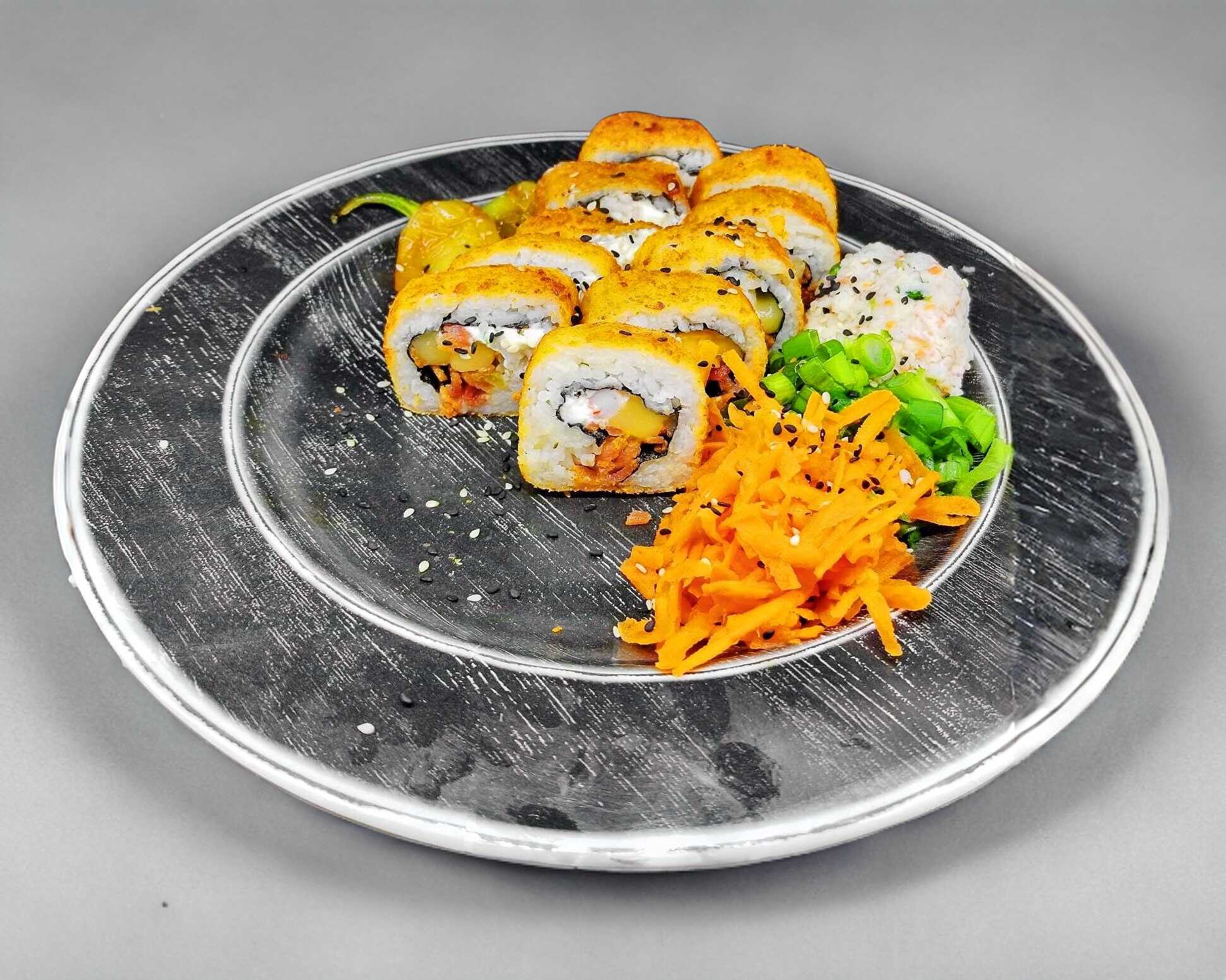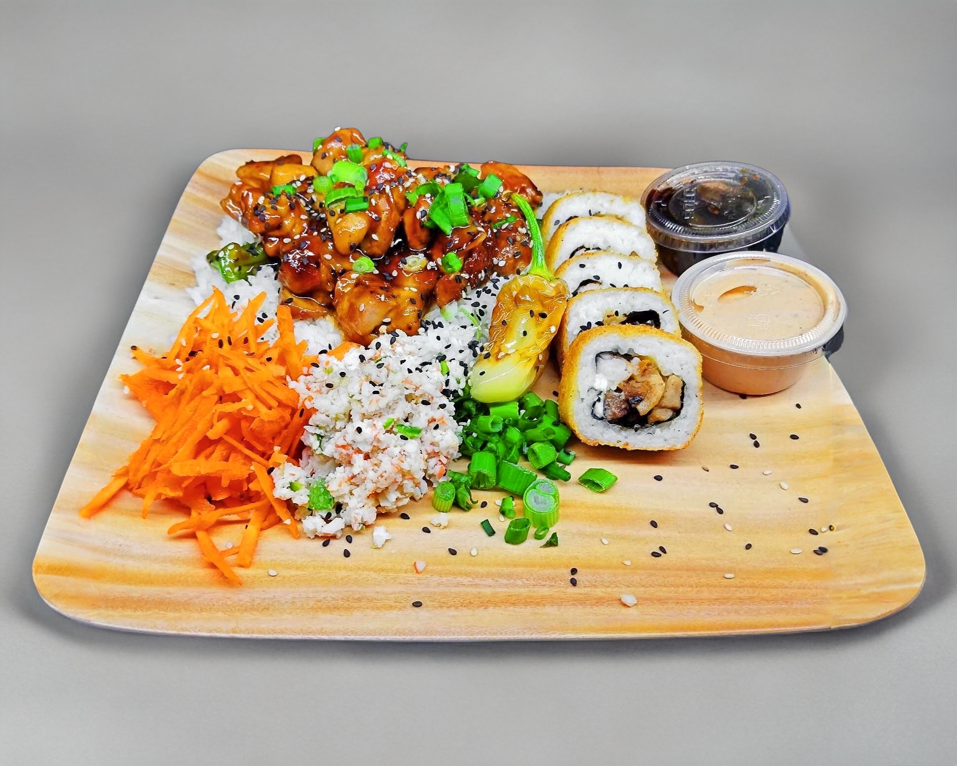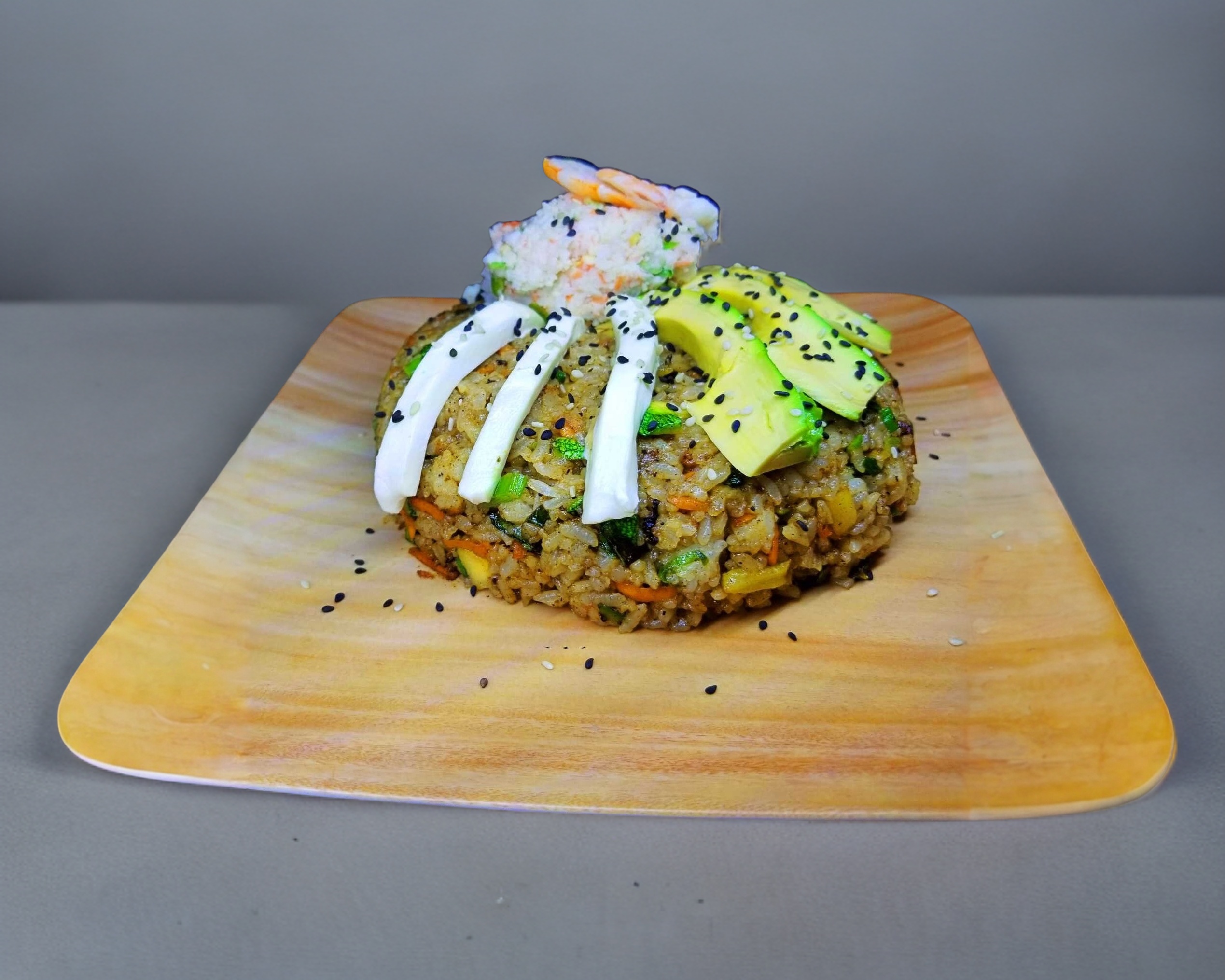 Arroz frito a la plancha, carne en pequeños trozos, huevo, calabacita, zanahoria y cebollín. con un topping de Philadelphia, aguacate y Tampico.