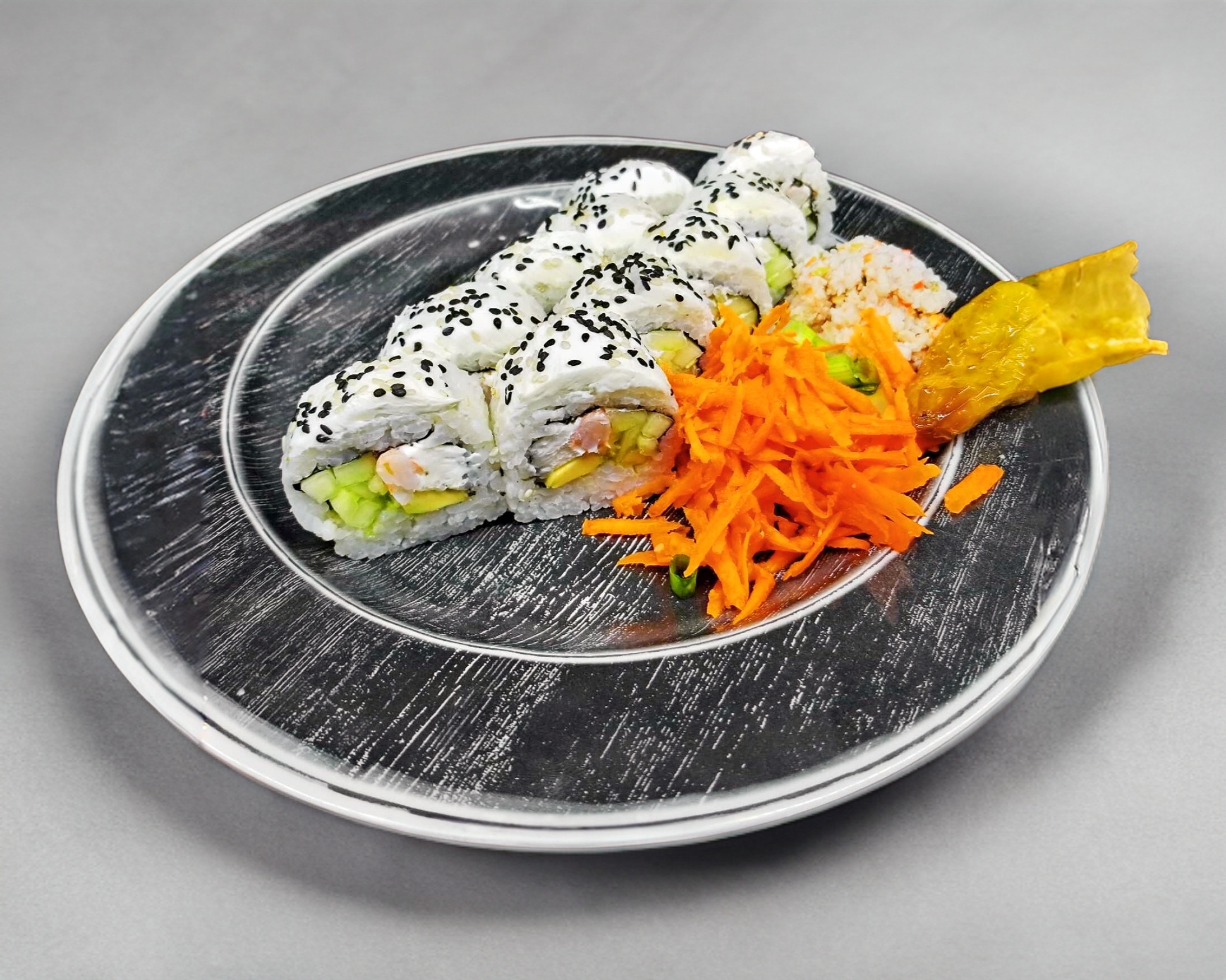 Camarón, pepino, aguacate y Philadelphia. Forrado de Philadelphia.