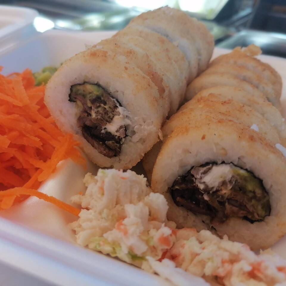 Carne asada, pepino, aguacate, y queso philadelphia.