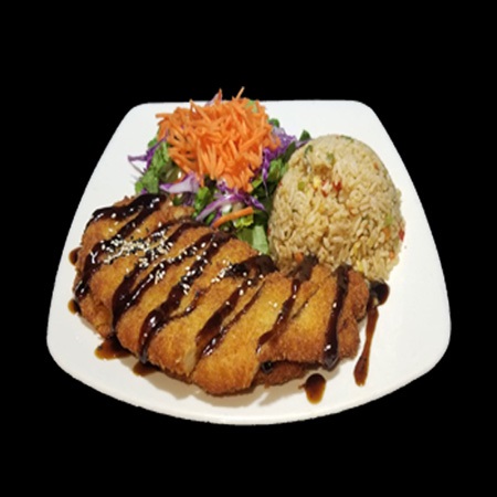 Pechuga de pollo empanizada, con un toque de salsa teriyaki acompañada con arroz frito y ensalada.