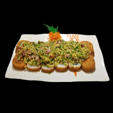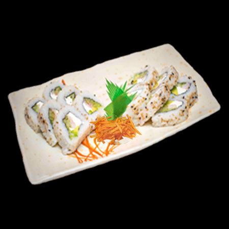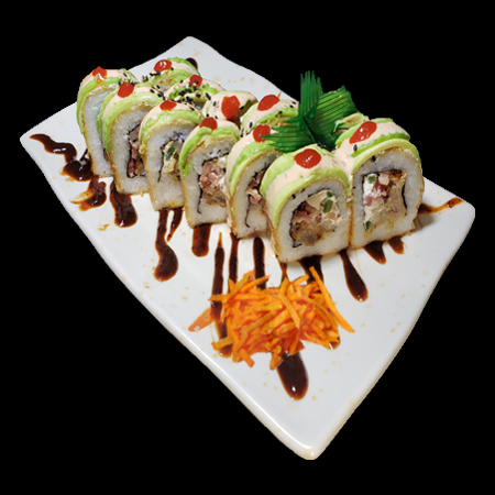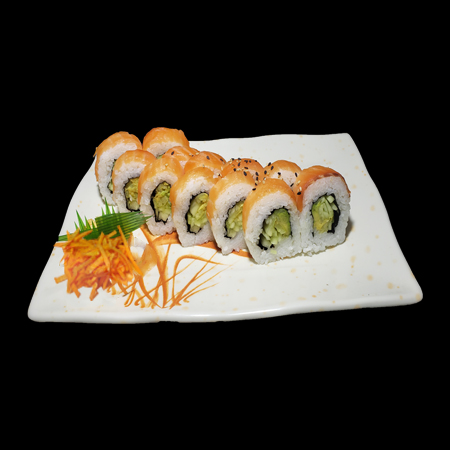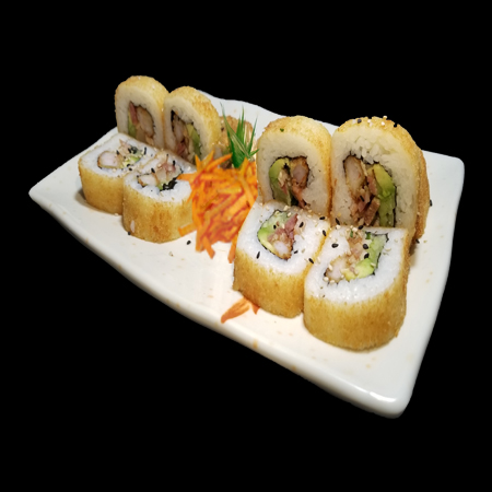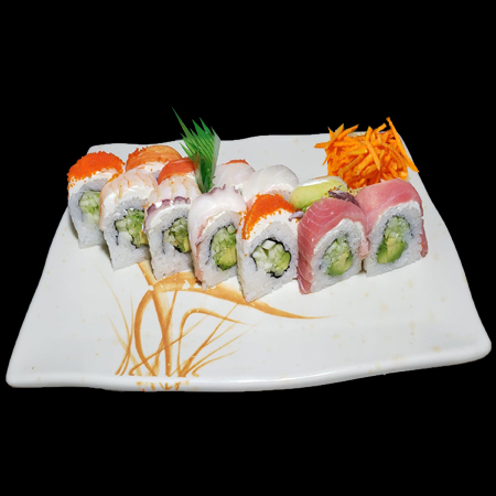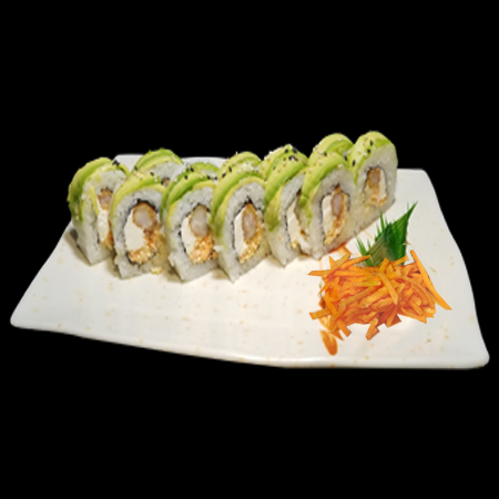Aguacate, queso, pepino, forrado con una porción de camarón, salmón, atún, kanikama y pulpo.