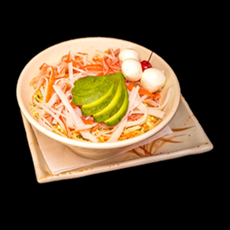 Surimi, verduras y tampico, servido con una porción de queso y aguacate.