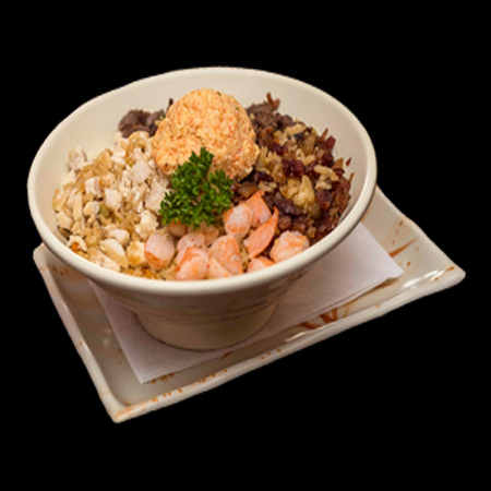 Arroz frito con verduras, carne, pollo, camarón, tocino y tampico.