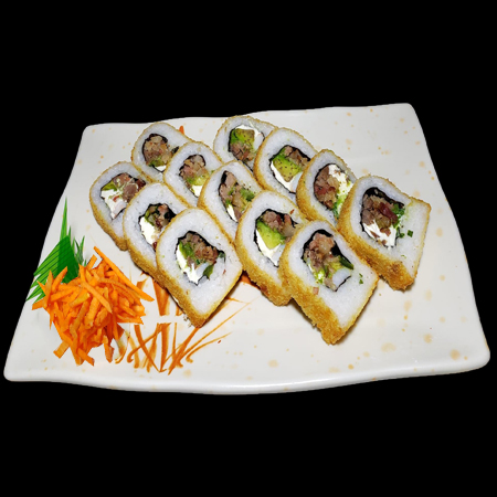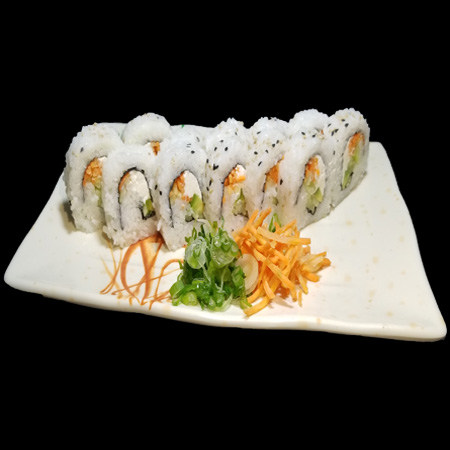 Surimi empanizado, queso philadelphia, aguacate,pepino y forrado de tampico.