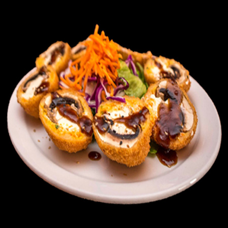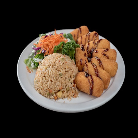 Camarones empanizados bañados con salsa teriyaki rellenos de queso, acompañados con arroz frito y ensalada (8 Piezas).