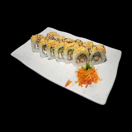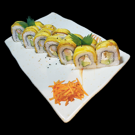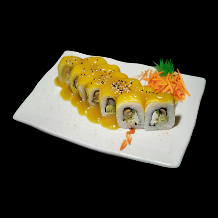 (Solo temporada) Camarón empanizado, aguacate, queso y pepino, forrado de mango y bañado con salsa especial.