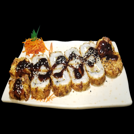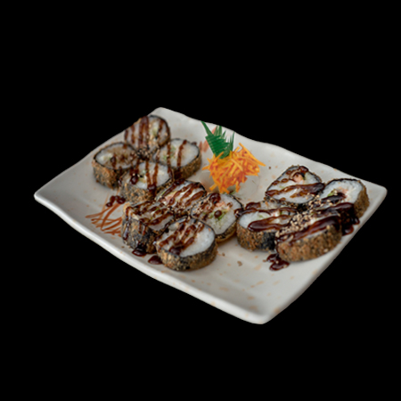 Queso, aguacate, pepino, camarón, salmón, pulpo, anguila, alga por fuera y bañado en salsa anguila.