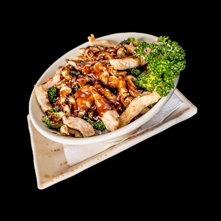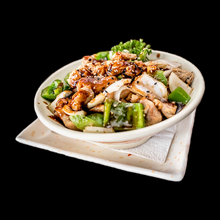 Pollo deshuesado a la plancha con morrón y cebolla, servido sobre arroz blanco y bañado en salsa teriyaki.