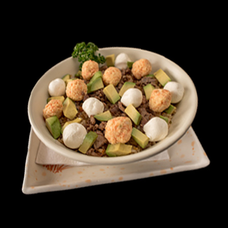 Arroz frito con verduras, carne, aguacate, queso y tampico.