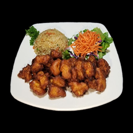 Trozos de proteina a elegir capeados con pasta picante, acompañados con arroz y ensalada.