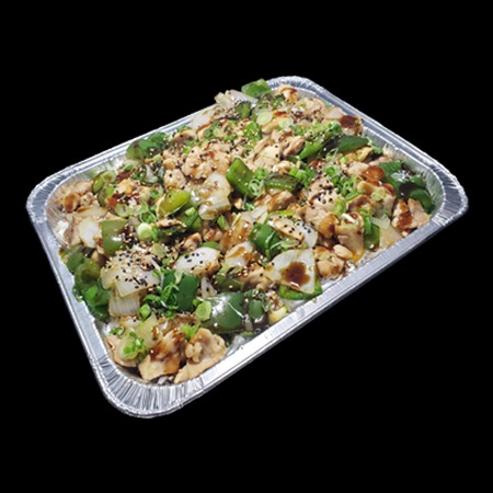 Cama de arroz blanco, con pollo deshuesado, morrón y cebolla, bañado en salsa teriyaki.